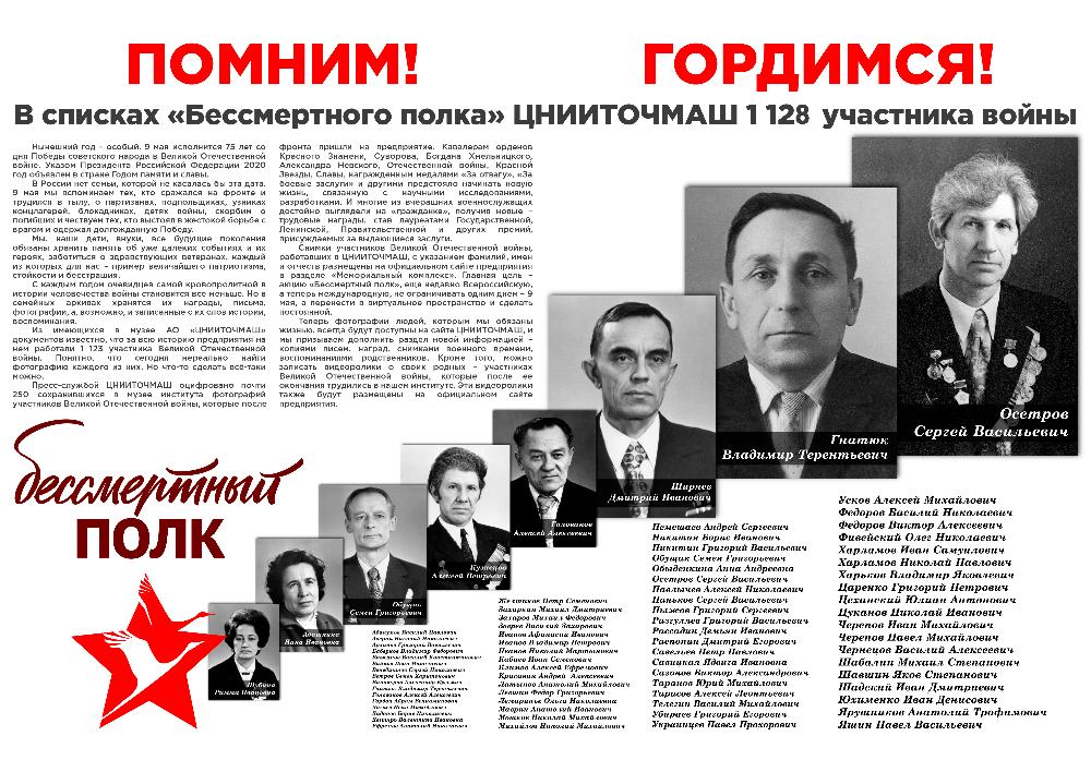 Снимки участников Великой Отечественной войны, работавших в ЦНИИТОЧМАШ, с указанием фамилий, имен и отчеств, датами службы в армии и работы на предприятии, размещены на официальном сайте института в разделе «Бессмертный полк». Главная цель – известную международную акцию не ограничивать одним днем – 9 Мая, а перенести в виртуальное пространство и сделать постоянной.