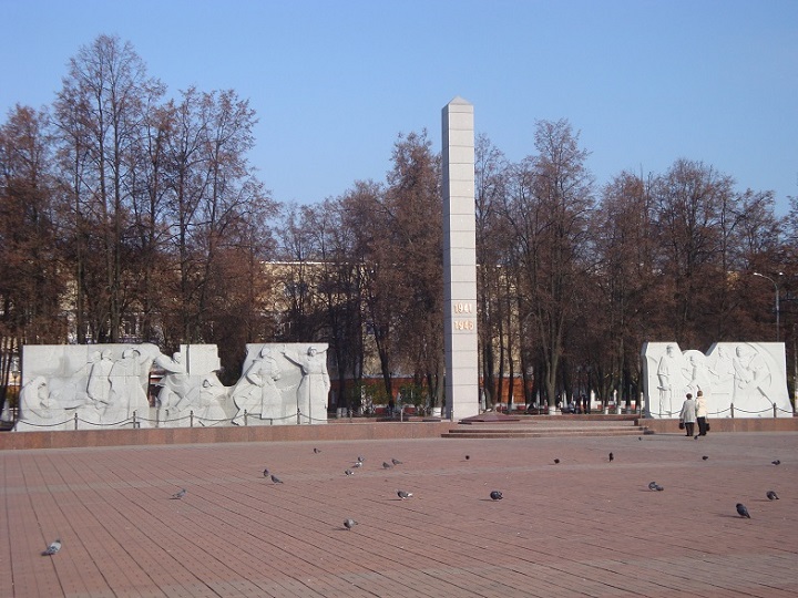МЕДИАЦЕНТР — 12 апреля, ПОДОЛЬСК — В 1971 году архитектурно-скульптурный ансамбль на площади 50-летия Октября, посвященный Великой Отечественной войне, представлял собой большую гранитную плиту с высеченными фигурами советских солдат, рвущихся в бой с гранатами и автоматами, а также словами: «Героям-подольчанам, жизнью своей защитившим Родину, честь и свободу», и зажжен вечный огонь. Авторы памятника Ю. Любимов и Л. Земсков.