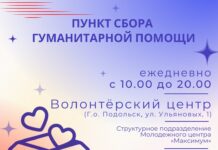 Новости округа В Волонтерском центре г. о. Подольск, расположенном по адресу ул. Ульяновых, д. 1, ежедневно с 10:00 до 20:00 продолжает работать пункт сбора гуманитарной помощи...