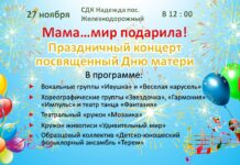 Культура В субботу, 27 ноября в 12-00  СДК «Надежда» поселка Железнодорожный приглашает на праздничный концерт «Мама…мир подарила!» посвященный замечательному празднику – Дню матери. Ребята, занимающиеся в...