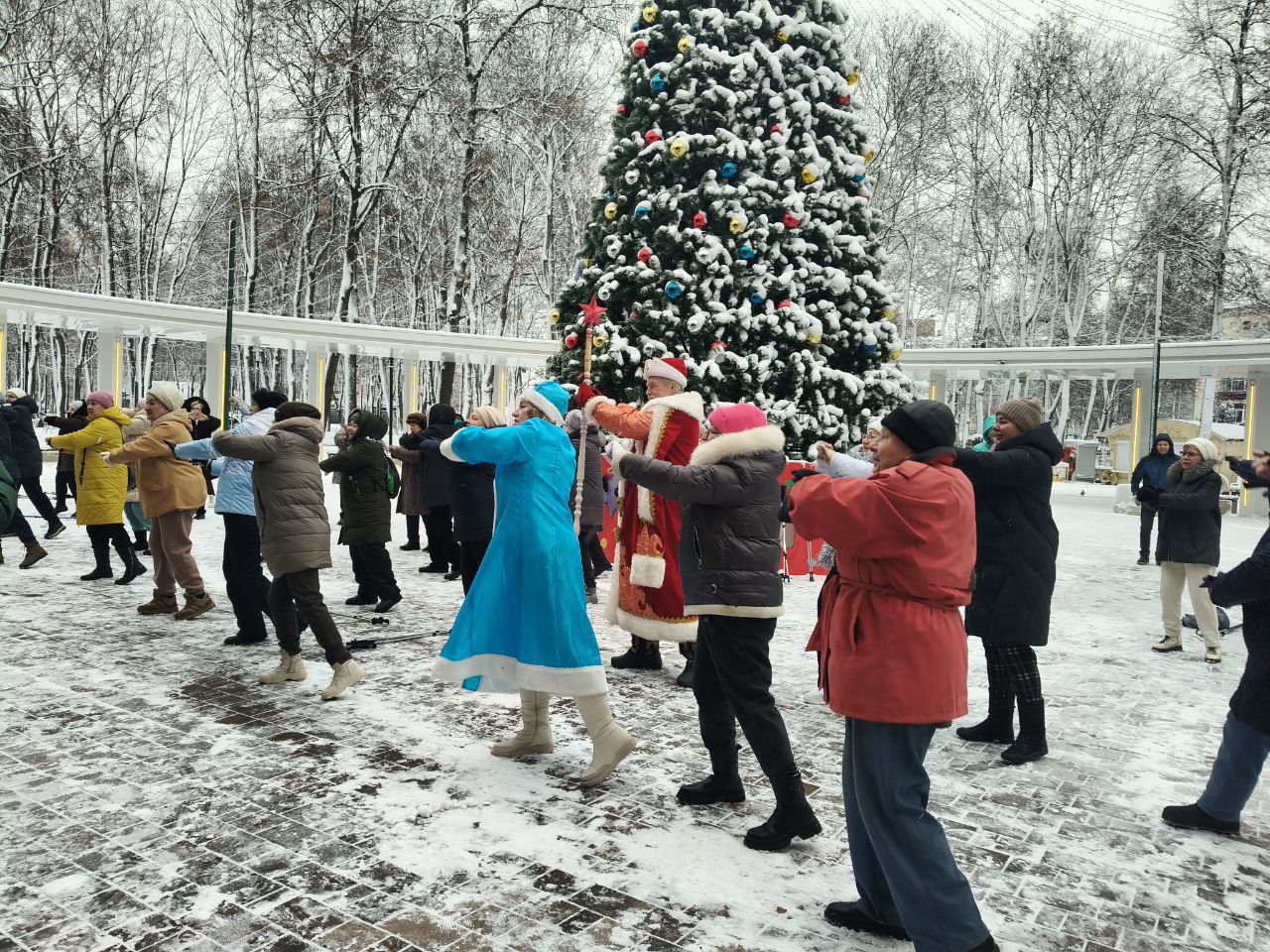 Любители скандинавской ходьбы из группы «Радость движения» под руководством тренера Владимира Васильева традиционно начали утро с разминки в парке Талалихина, дополнив ее новогодней программой. Участники мероприятия поздравили друг друга и представителей администрации парка с наступающим Новым годом.