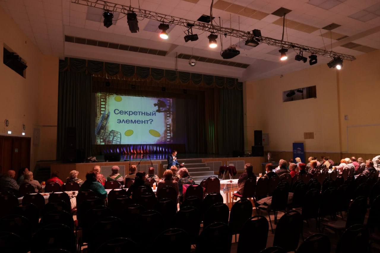 Программа вечера получилась насыщенной: гостей ждала видеовикторина «Секретный элемент», а затем — душевный музыкальный блок. Вместе с хором «Родники» зрители исполнили знакомые песни из советских фильмов. Кульминация мероприятия – показ российской комедийной картины «Бедная Саша».