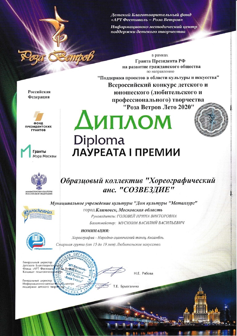 Образцовый коллектив «Хореографический ансамбль «Созвездие» Дома культуры «Металлург» стал лауреатом I премии в номинации «Хореография – народно-сценический танец. Ансамбль. Старшая группа (от 15 до 19 лет). Любительское искусство» Всероссийского конкурса детского и юношеского (любительского и профессионального) творчества “Роза ветров. Лето-2020”.