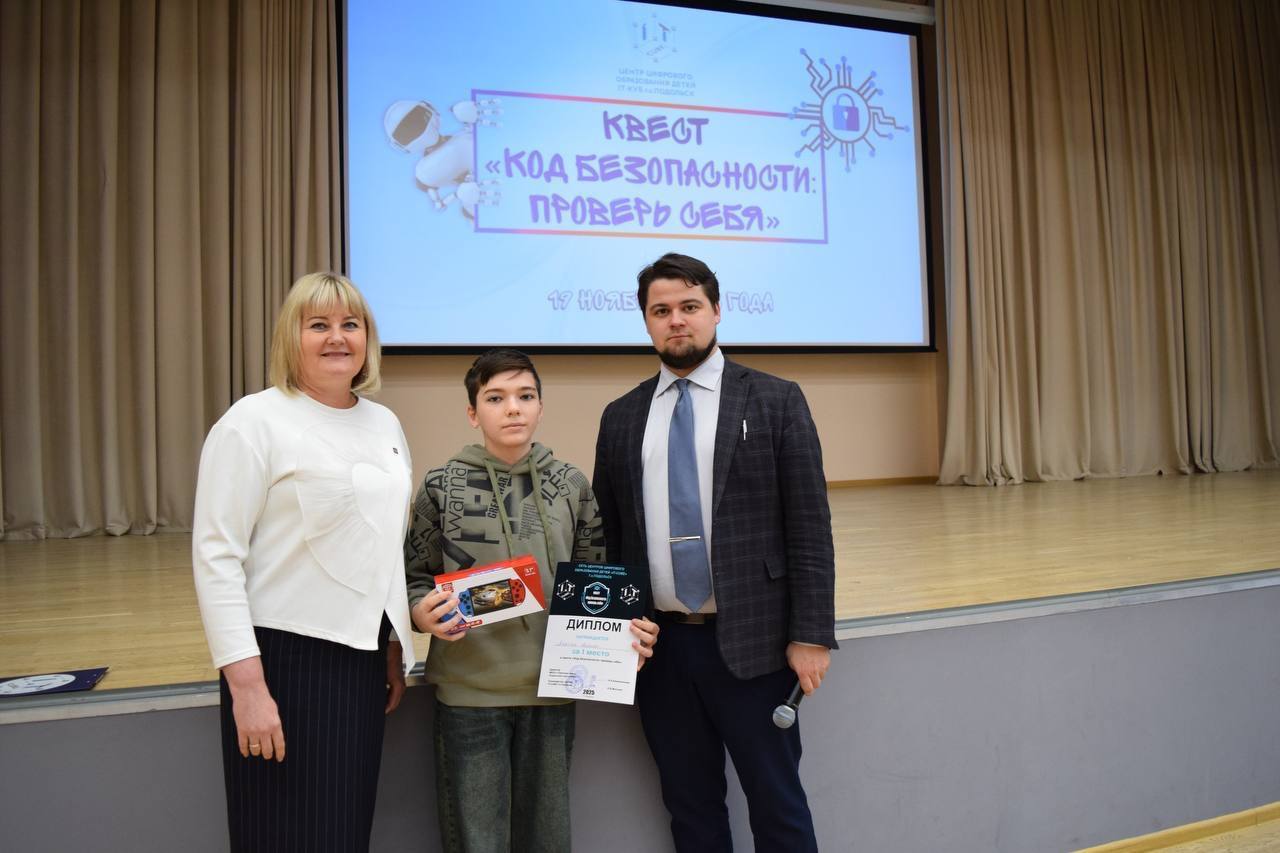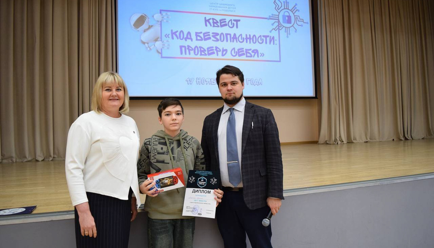 Победители и призеры получили заслуженные награды на торжественной церемонии, где их поздравили директор гимназии имени Подольских курсантов и руководитель центра цифрового образования детей «IT‑куб» г. о. Подольск.
