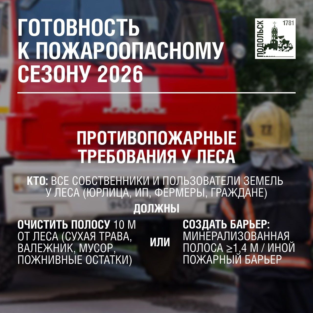Напоминим, что все организации, предприниматели и граждане, чьи территории прилегают к лесным массивам, обязаны обеспечивать их очистку от сухой растительности и горючих материалов либо создавать противопожарные барьеры в соответствии с установленными требованиями.
