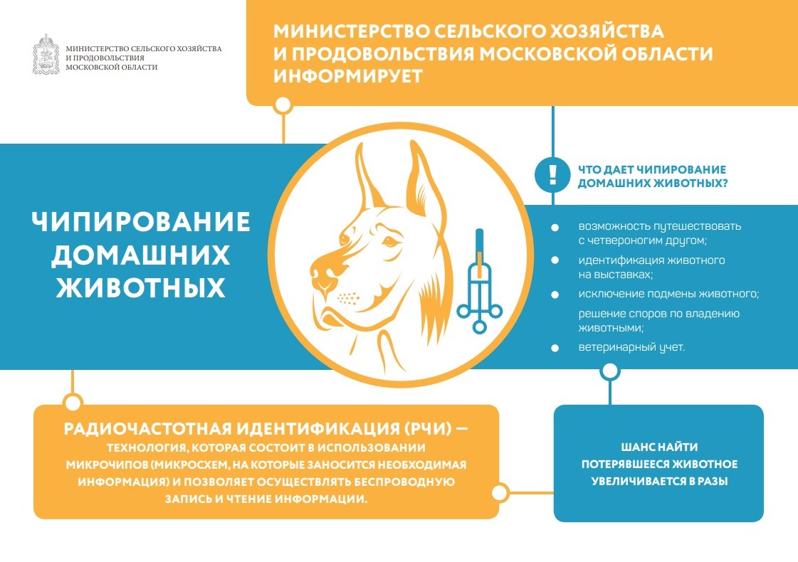 Министерство сельского хозяйства и продовольствия Московской области информирует владельцев домашних животных о дополнительных возможностях, которые дает чипирование питомца. Чипирование домашних животных сейчас можно делать по желанию граждан на ветеринарных участках, отметил министр сельского хозяйства и продовольствия Московской области Андрей Разин.