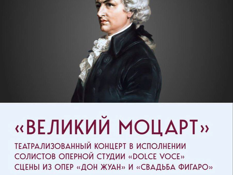 Культура Программа «Великий Моцарт» (сцены из опер В. А. Моцарта «Дон Жуан» и «Свадьба Фигаро») прозвучит в исполнении солистов оперной студии Dolce Voce.