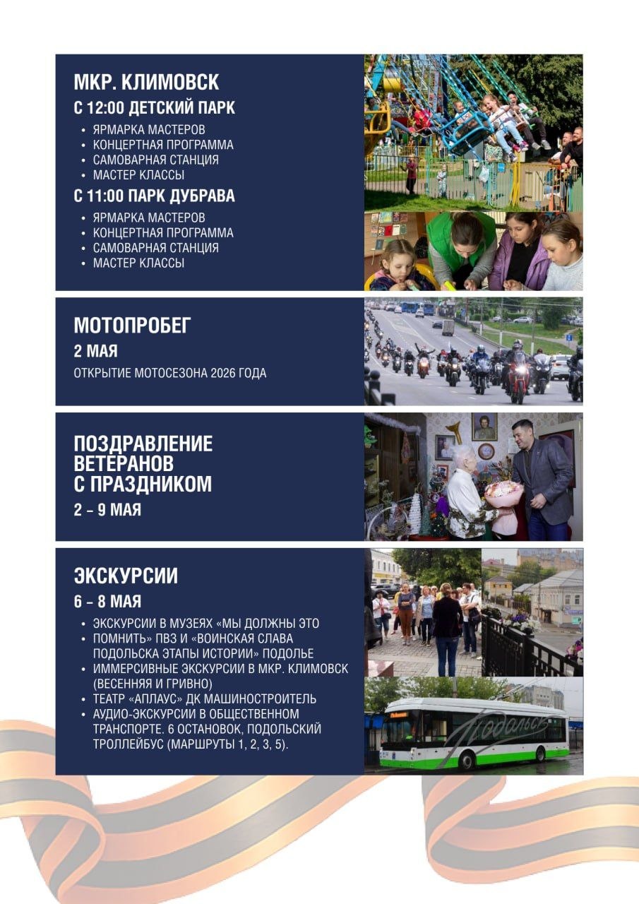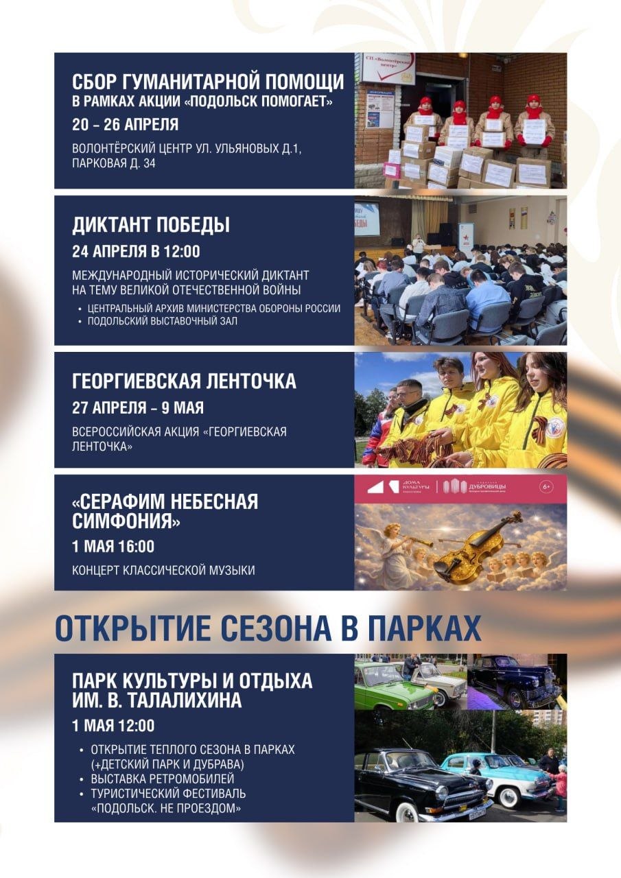 Особое внимание уделяется подготовке ко Дню Победы. В Подольске уже стартовали патриотические и благотворительные акции. Продолжается акция «Подольск помогает» — жители активно собирают гуманитарную помощь для защитников. Присоединиться может каждый.