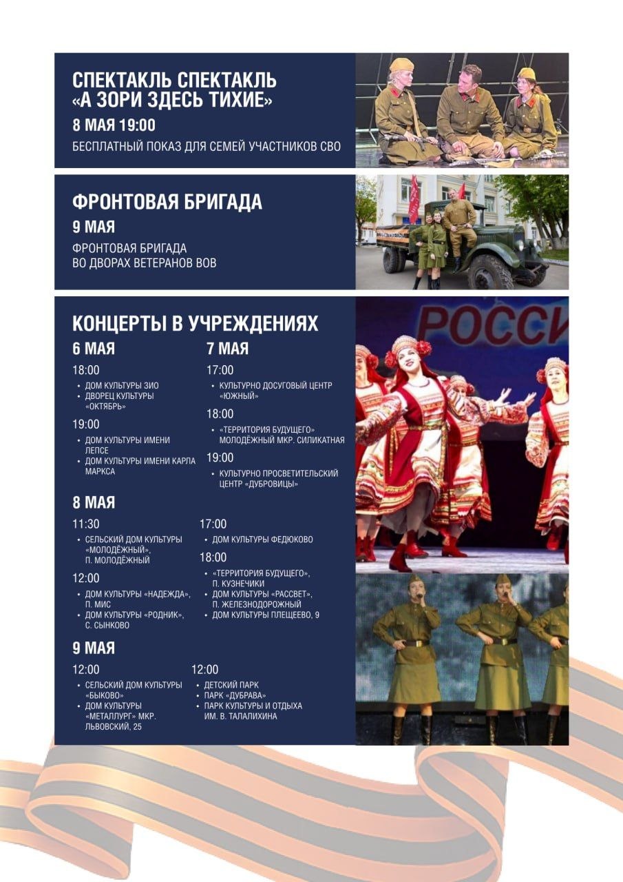 9 мая — центральный день празднования. Пройдут возложения цветов у мемориалов и памятников воинской славы, торжественные мероприятия на площади Славы и в микрорайонах округа. Будет развернута масштабная копия Знамени Победы. Во дворах ветеранов выступят фронтовые концертные бригады — эта традиция остаётся одной из самых теплых и значимых.