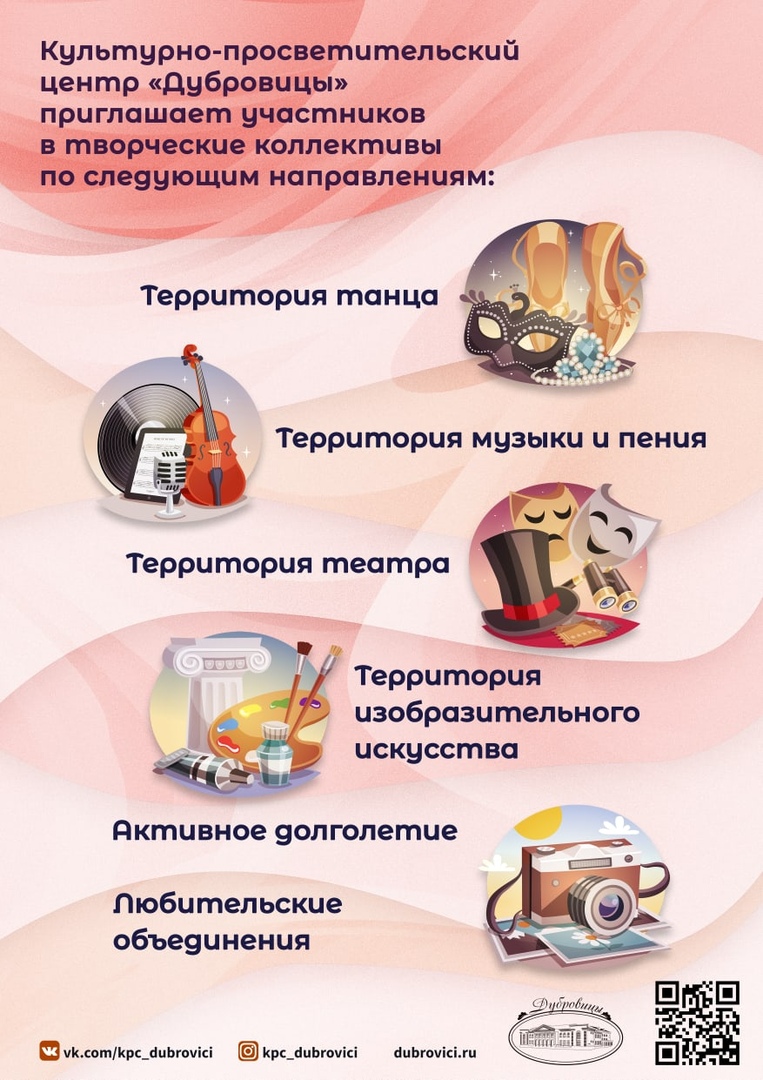 МЕДИАЦЕНТР — 6 июля, ПОДОЛЬСК — Как сообщили в Комитете по культуре и туризму администрации Городского округа Подольск, Культурно-просветительский центр «Дубровицы» приглашает новых участников в творческие коллективы по следующим направлениям: