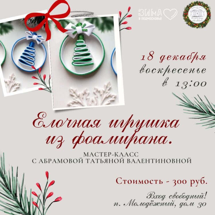 18 декабря в 13.00 под руководством Абрамовой Татьяны Валентиновны состоится мастер-класс “Елочная игрушка из фоамирана”. У вас получится создать свой шедевр.