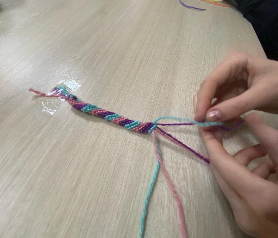 Участники узнали о значении слова «фенечка», об используемых материалах и традициях плетения. Разобрав поэтапность изготовления изделия, каждый создал свою цветовую гамму из пряжи – фенечки получились красочными и оригинальными.