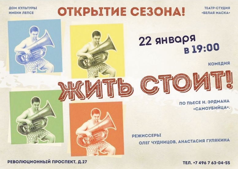 Спектакль в постановке Народного коллектива «Театр-студия «Белая маска» по пьесе Н. Эрдмана «Самоубийца». Одна из первых «черных» комедий в литературе была написана в 1928 году, при жизни автора не печаталась и не ставилась в театре.