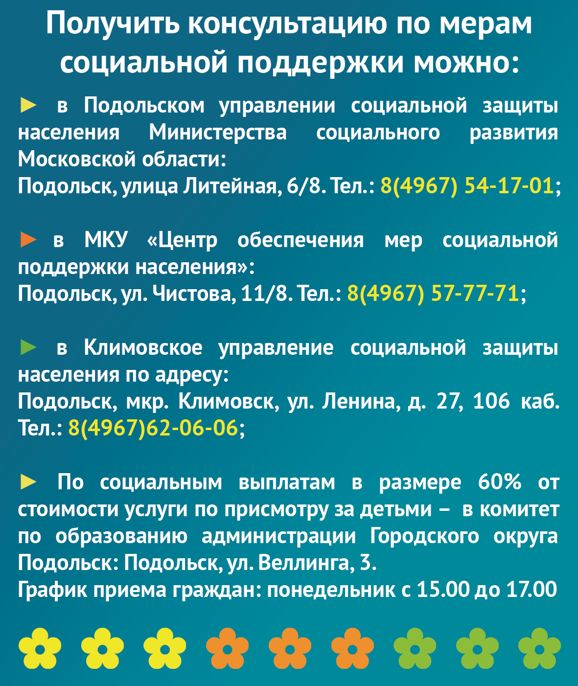 Кроме социальной выплаты в размере 60% от стоимости услуги по присмотру за детьми (для малоимущих эта выплата по заявлению может быть назначена дополнительно к льготе в 50% на оплату услуги по присмотру за детьми), в Подольске можно получить единовременную денежную выплату в размере 3 000 рублей. Ее получают семьи (либо одинокие родители) в связи с рождением третьего и последующих детей. Выплата носит заявительный характер, обратиться за назначением можно в муниципальное казенное учреждение «Центр обеспечения мер социальной поддержки населения». Кстати, до объединения Большого Подольска ей пользовались только в Климовске, после объединения выплата была сохранена и введена на всей территории округа.