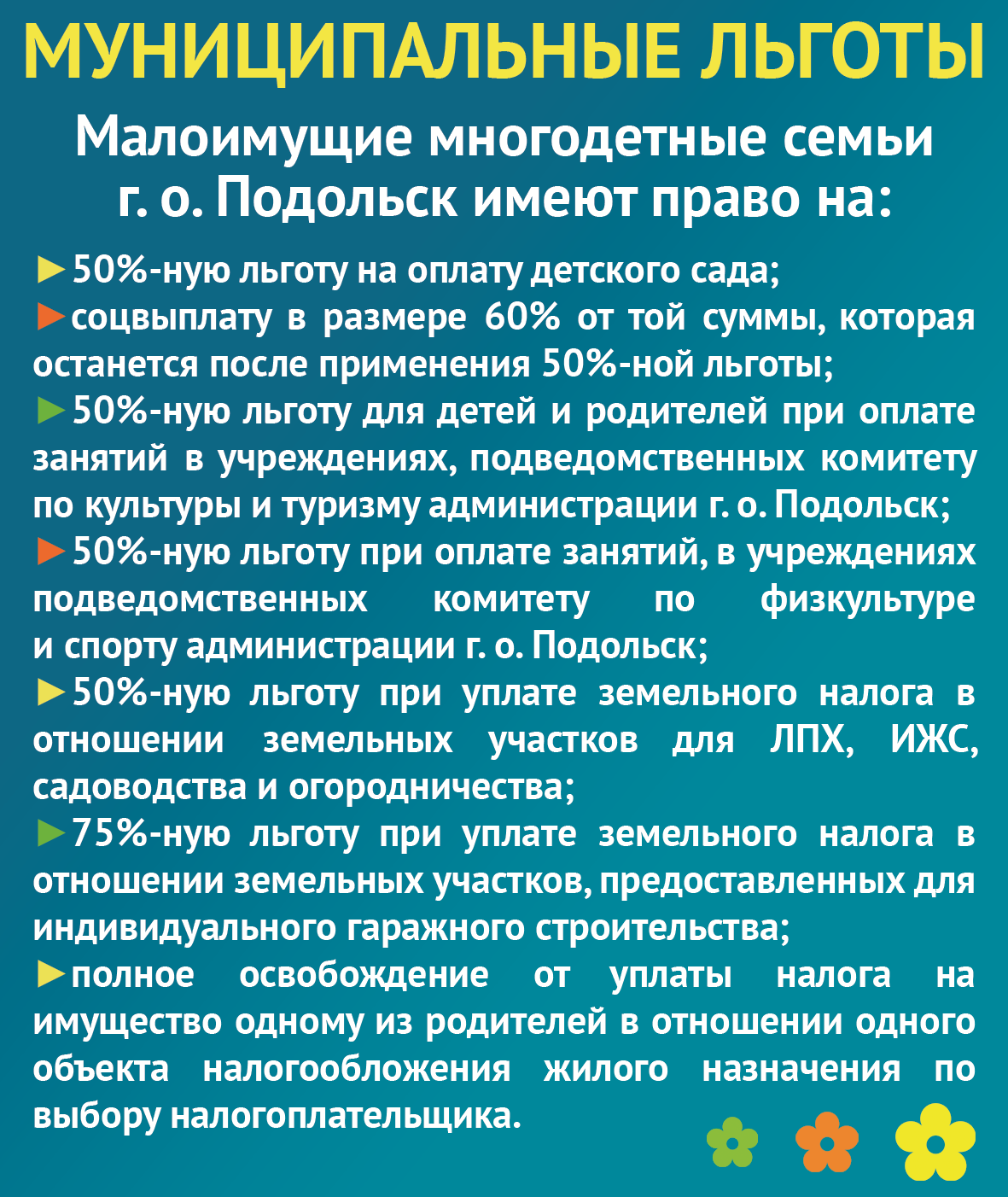 Малоимущие семьи дополнительно получают 50%-ю льготу на кружки и секции, работающие при муниципальных учреждениях, бесплатные новогодние подарки. Семья, в которой семеро и более детей, освобождается от платы за все перечисленные выше услуги.