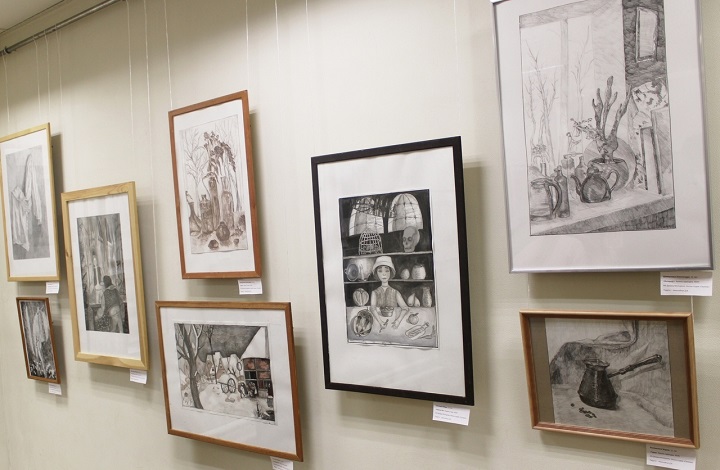Сын Аллы Александровны Даниил Николайчук также педагог школы-студии. Он рассказал, что на выставке представлены учебные рисунки, натюрморты, графика, живопись и книжные иллюстрации.