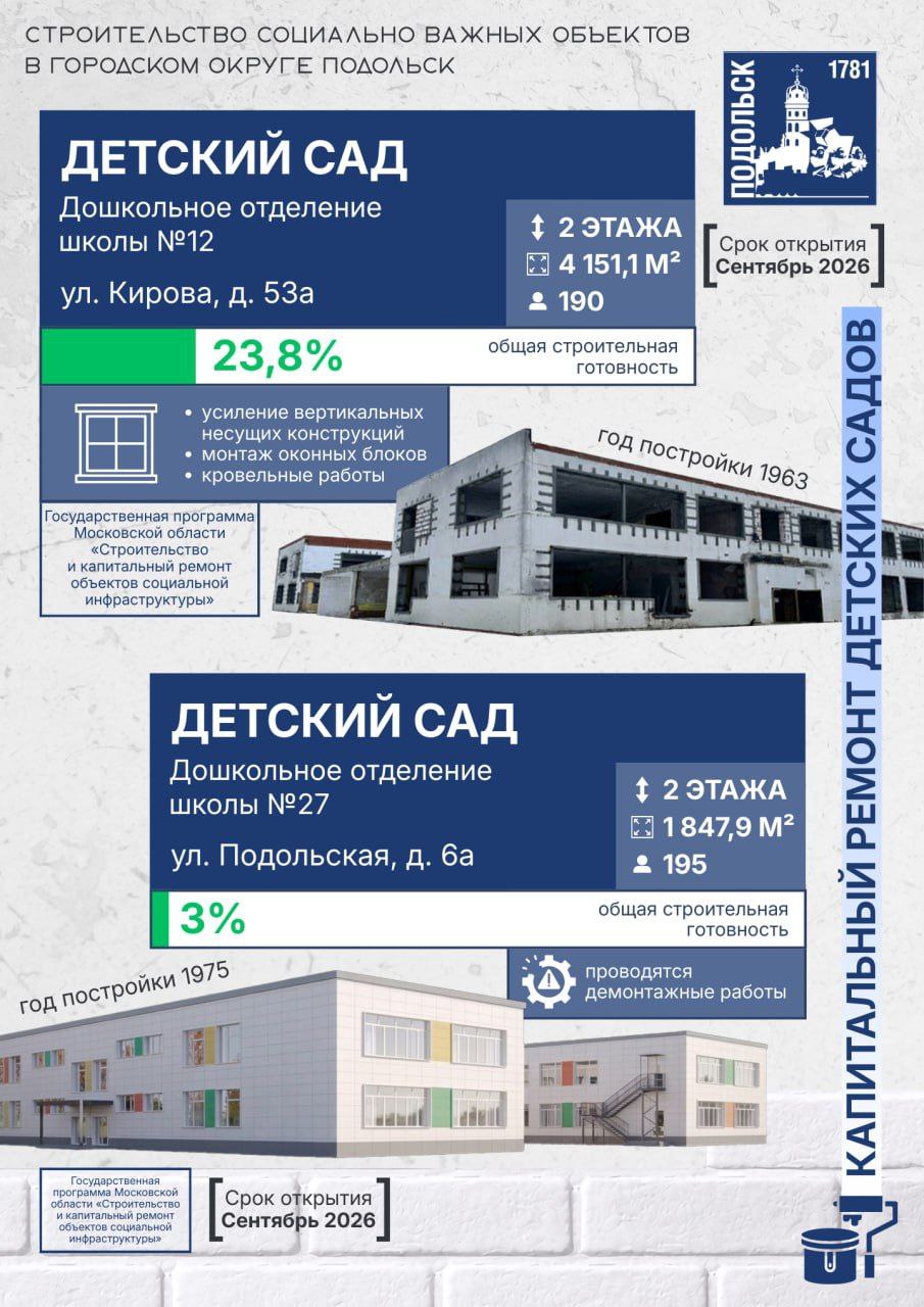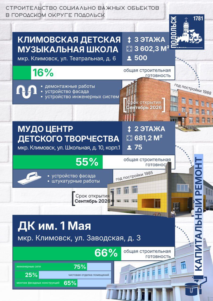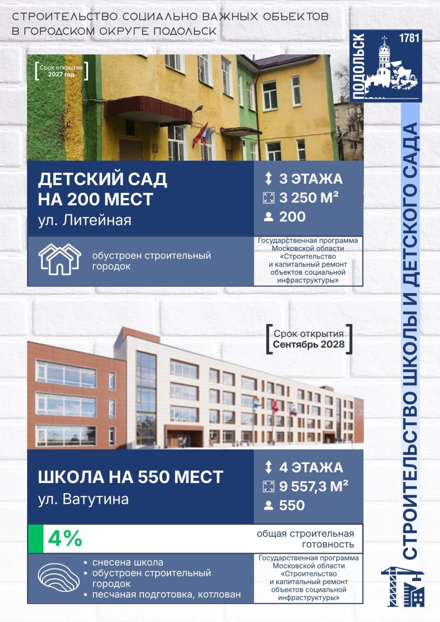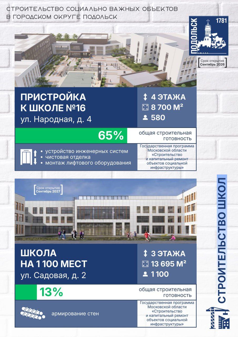 Несмотря на трудности на отдельных участках, наша задача неизменна — сдать все объекты качественно и в срок. Важно создать для юных подольчан достойную среду для учебы, творчества и досуга», — сообщил глава городского округа Подольск Григорий Артамонов.