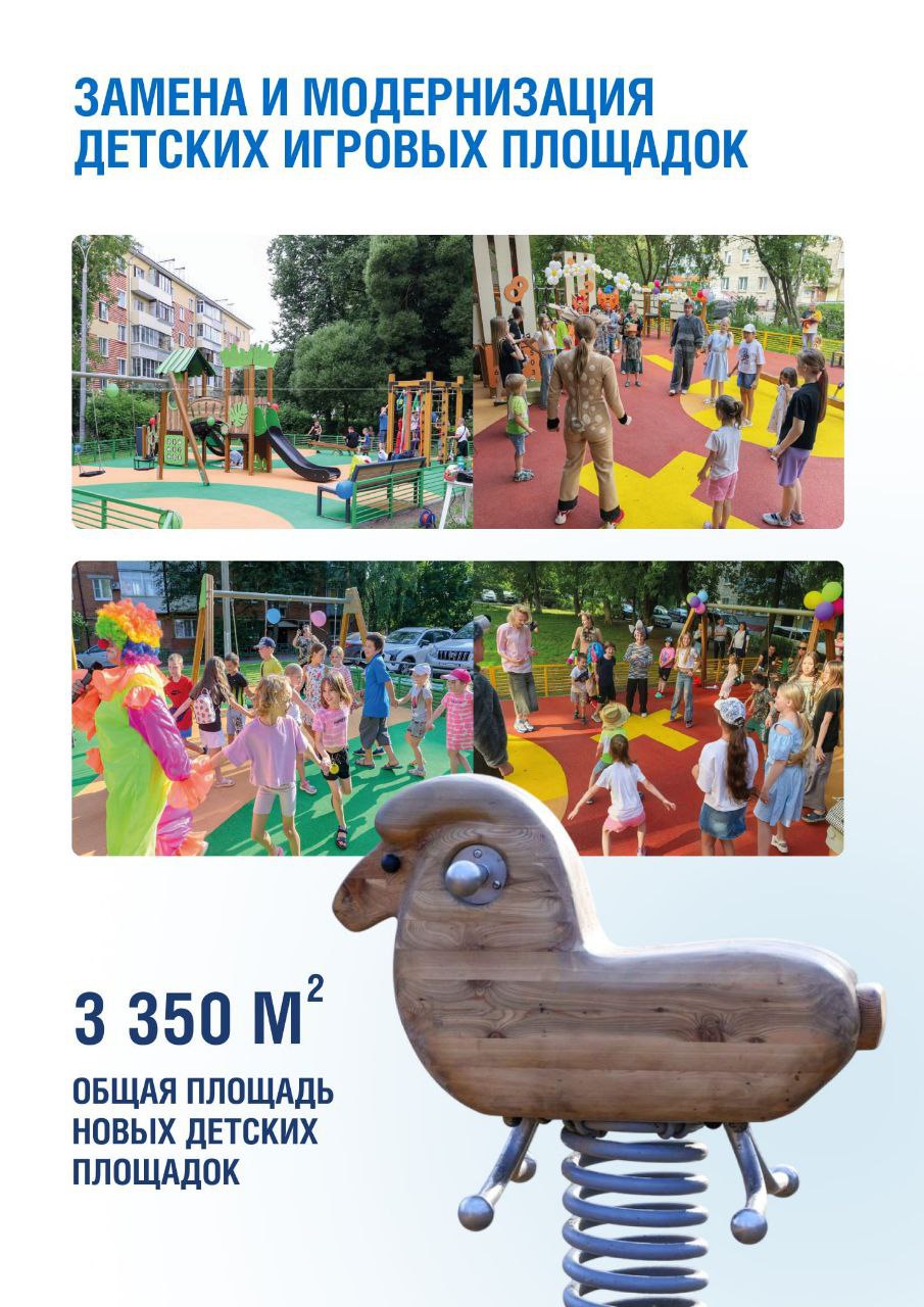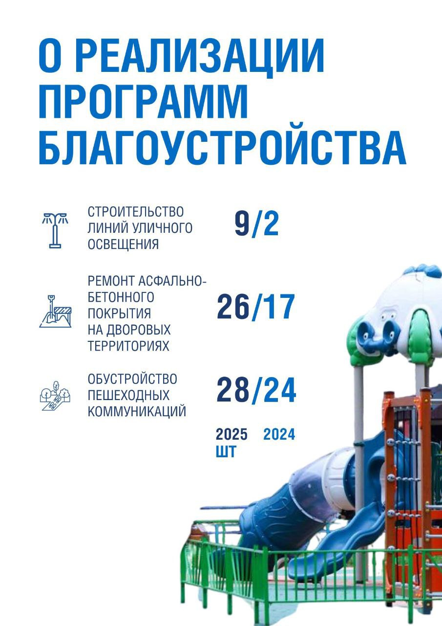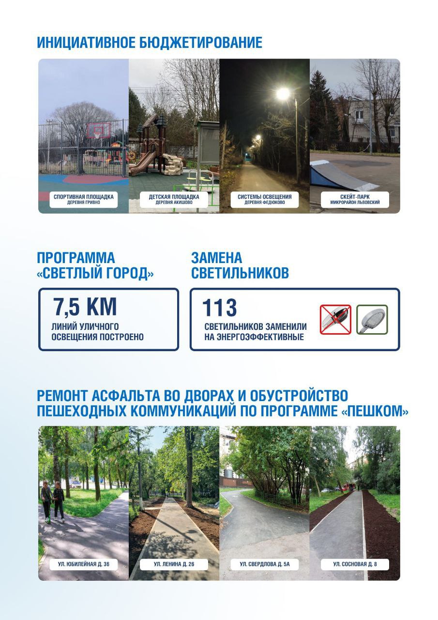 Малые объекты, включая детские площадки, также получили внимание. Были реализованы проекты инициативного бюджетирования в деревнях Гривно, Акишово, Федюково и в микрорайоне Львовском. Продолжились работы на придомовых территориях – общая площадь ремонта составила более 107 тысяч м². В рамках программы создания пешеходных коммуникаций привели в порядок протоптанные жителями дорожки общей протяженностью 1,7 км. Важным направлением стало строительство линий уличного освещения – построено 7,5 км и заменено 113 неэнергоэффективных светильников.