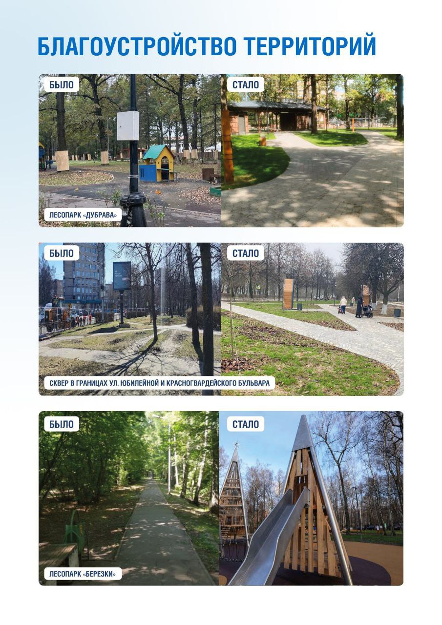 В парке Талалихина теперь есть комфортная набережная. Вдоль Парадного проезда, где раньше была лесополоса с протоптанными тропинками, сделали удобную сеть дорожек с различным покрытием, установили спортивные, детскую и скейт-площадки, пирсы, туалетный модуль, зону для выгула собак и освещение. Значимым объектом стал парк «Дубрава» в Климовске – здесь благоустроили почти 34 гектара. Также обновили скверы имени Пестова, Пушкина, Папирова, Спасателей и лесопарк «Березки».