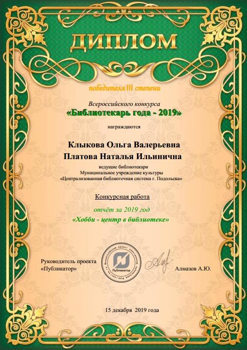 Подведены итоги Всероссийского конкурса «Библиотекарь года–2019» проекта «Публикатор», об этом сообщили в Комитете по культуре и туризму администрации Городского округа Подольск.