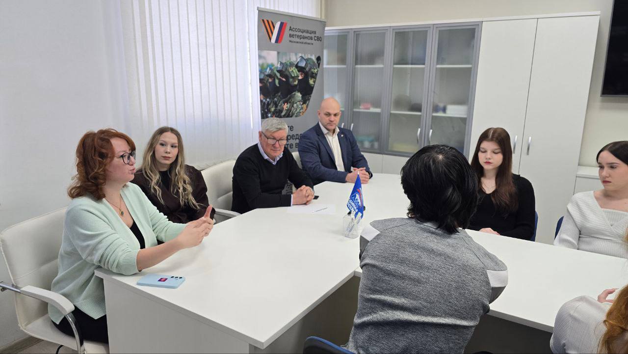 Студенты обсудили вопросы трудоустройства и поделились опытом работы в «Российских студенческих отрядах» с первым заместителем председателя Совета депутатов городского округа Подольск Евгением Патрушевым и членом Ассоциации участников СВО Артемом Падалкой.
