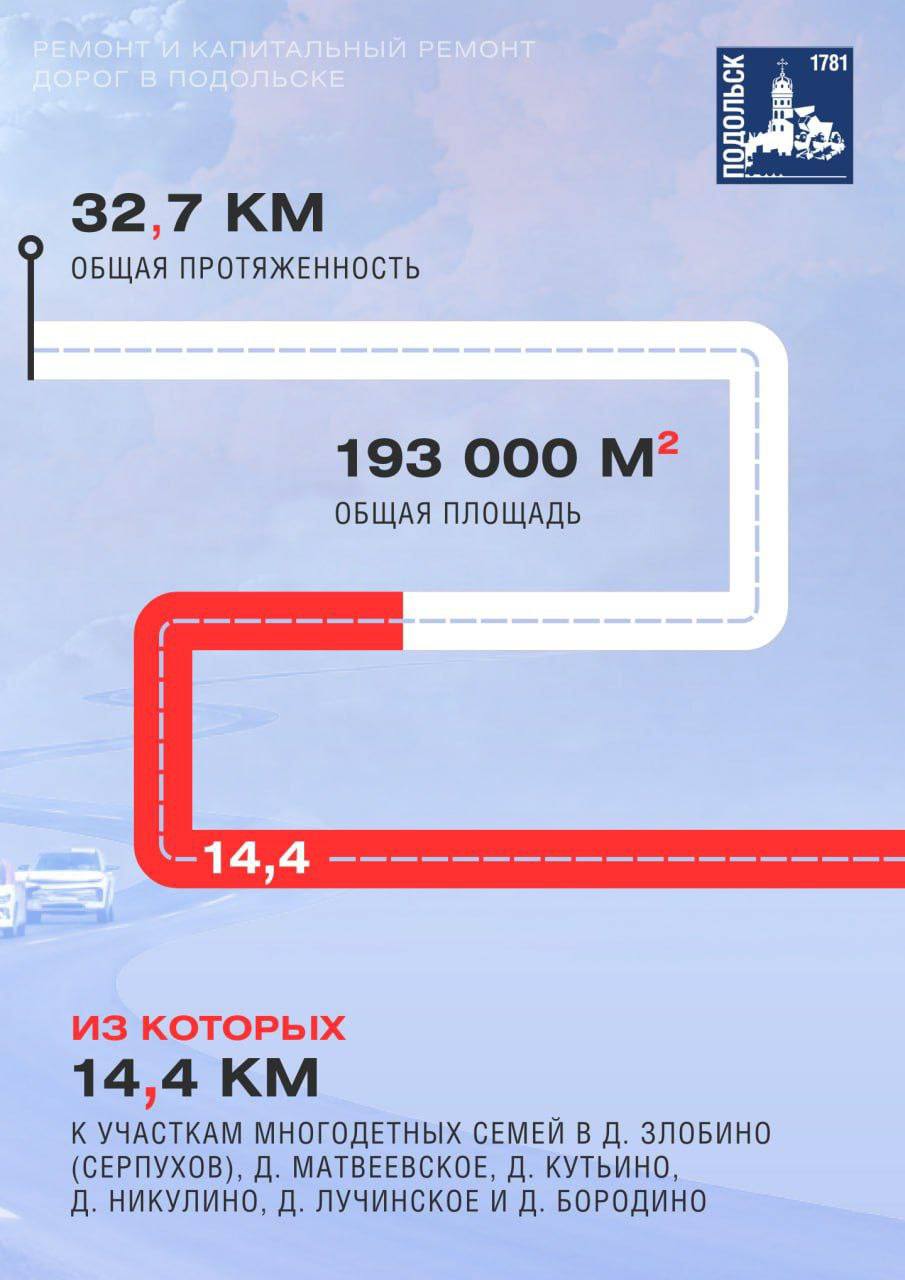 В этом году в городском округе в программу ремонта включены 39 муниципальных дорог общей протяженностью почти 33 километра. Значительная часть — к участкам многодетных семей, отремонтируют более 14 километров дорожного полотна.