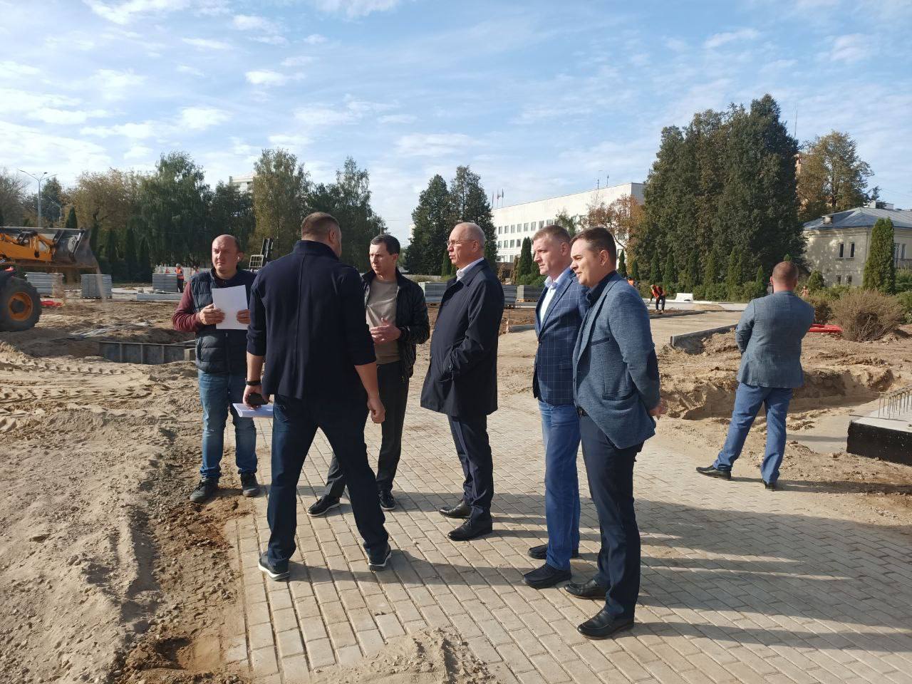 Все работы ведутся в соответствии с производственным графиком. Завершены демонтаж старых элементов и подготовка площади, подведены все необходимые коммуникации. Рабочие устанавливают малые архитектурные формы, на 60 % уложена новая плитка. Впереди остаются самые важные этапы — устройство нового фонтана и стелы.