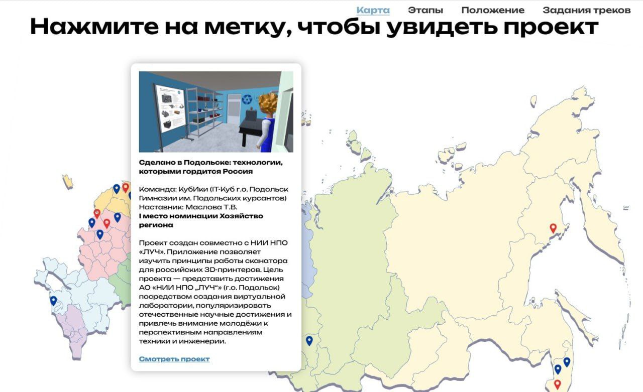 Юные подольчане представили интерактивную VR-лабораторию, посвященную работе сканатора для российских 3D-принтеров. Проект занял первое место в номинации «Хозяйство региона» среди учащихся 10–11-х классов и был отмечен на цифровой карте страны как значимый вклад в развитие отечественных технологий.