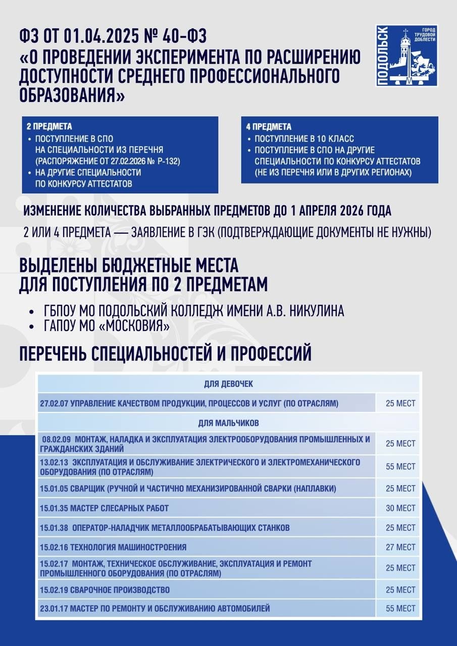 В 2026 году Московская область участвует в федеральном эксперименте по расширению доступности среднего профессионального образования. Теперь для поступления в колледж достаточно сдать два обязательных экзамена — русский язык и математику. В нашем округе к проекту подключены Подольский колледж имени А. В. Никулина и колледж «Московия», где уже выделены бюджетные места по востребованным рабочим специальностям.