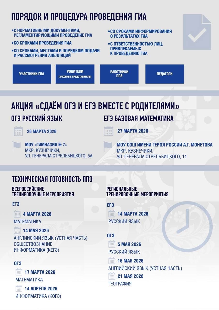 Важное внимание уделяется и психологическому комфорту. В марте прошла акция «Сдаем ОГЭ и ЕГЭ вместе с родителями», где взрослые смогли на собственном опыте пройти процедуру. А до конца апреля состоится акция «100 баллов для Победы» — встречи с выпускниками, успешно преодолевшими этот путь.