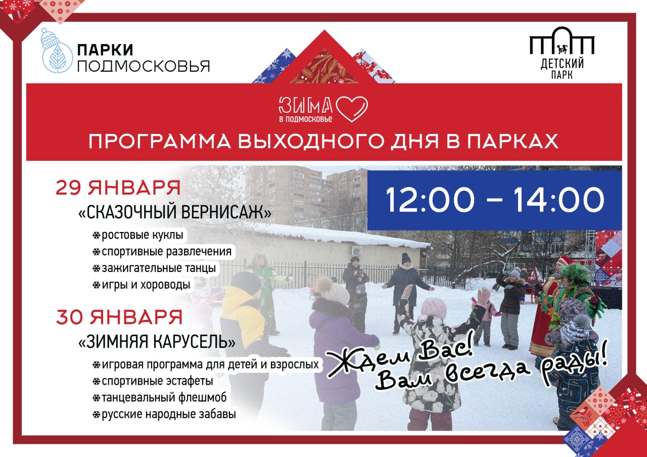 Программы выходного дня в парках Городского округа Подольск в рамках проекта губернатора «Зима в Подмосковье» продолжаются. Интерактивные и развлекательные программы, подготовленные учреждениями культуры администрации муниципалитета, запланированы 29 и 30 января, 5, 6, 12, 13, 19, 20, 26 и 27 февраля.