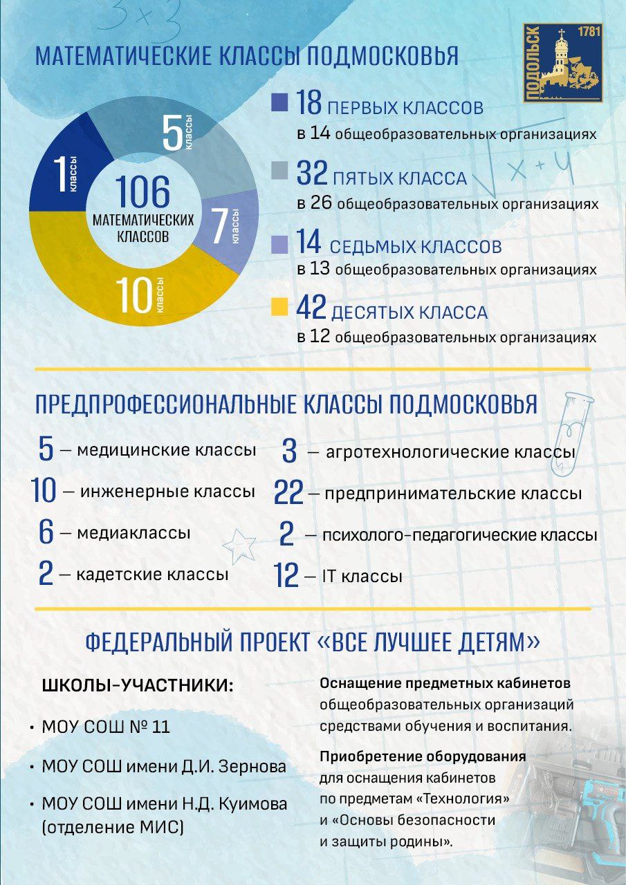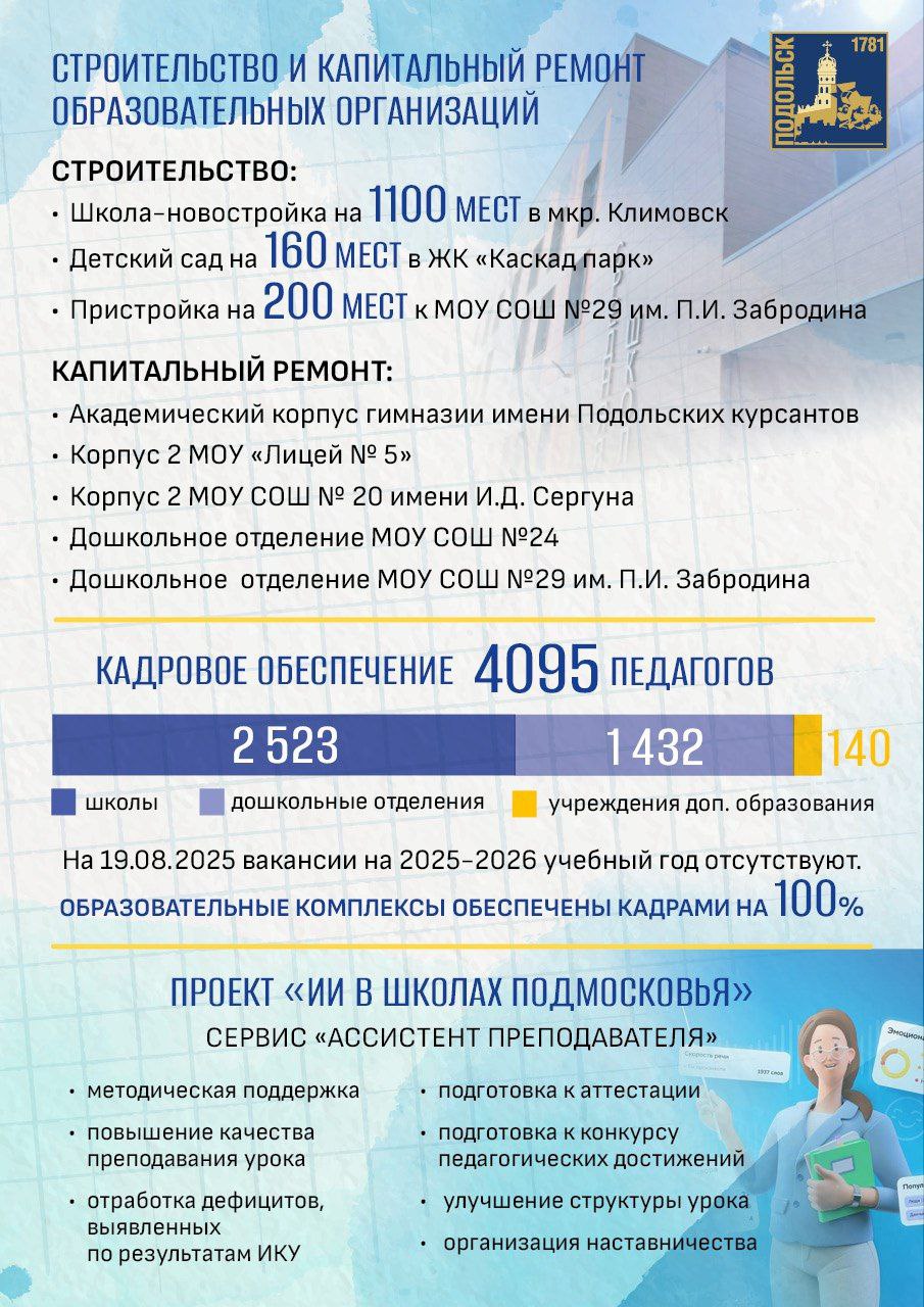 Учебный год будет богатым на новые проекты. Школы округа подключаются к «Математическим классам Подмосковья». Также все 10-е классы получат статус предпрофессиональных – наши старшеклассники смогут учиться по разным направлениям: медицинском, инженерном, IT, предпринимательском, кадетском и других. А подольские педагоги станут участниками проекта «ИИ в школах Подмосковья» – цифровой помощник будет помогать учителям анализировать уроки и делать занятия ещё эффективнее.