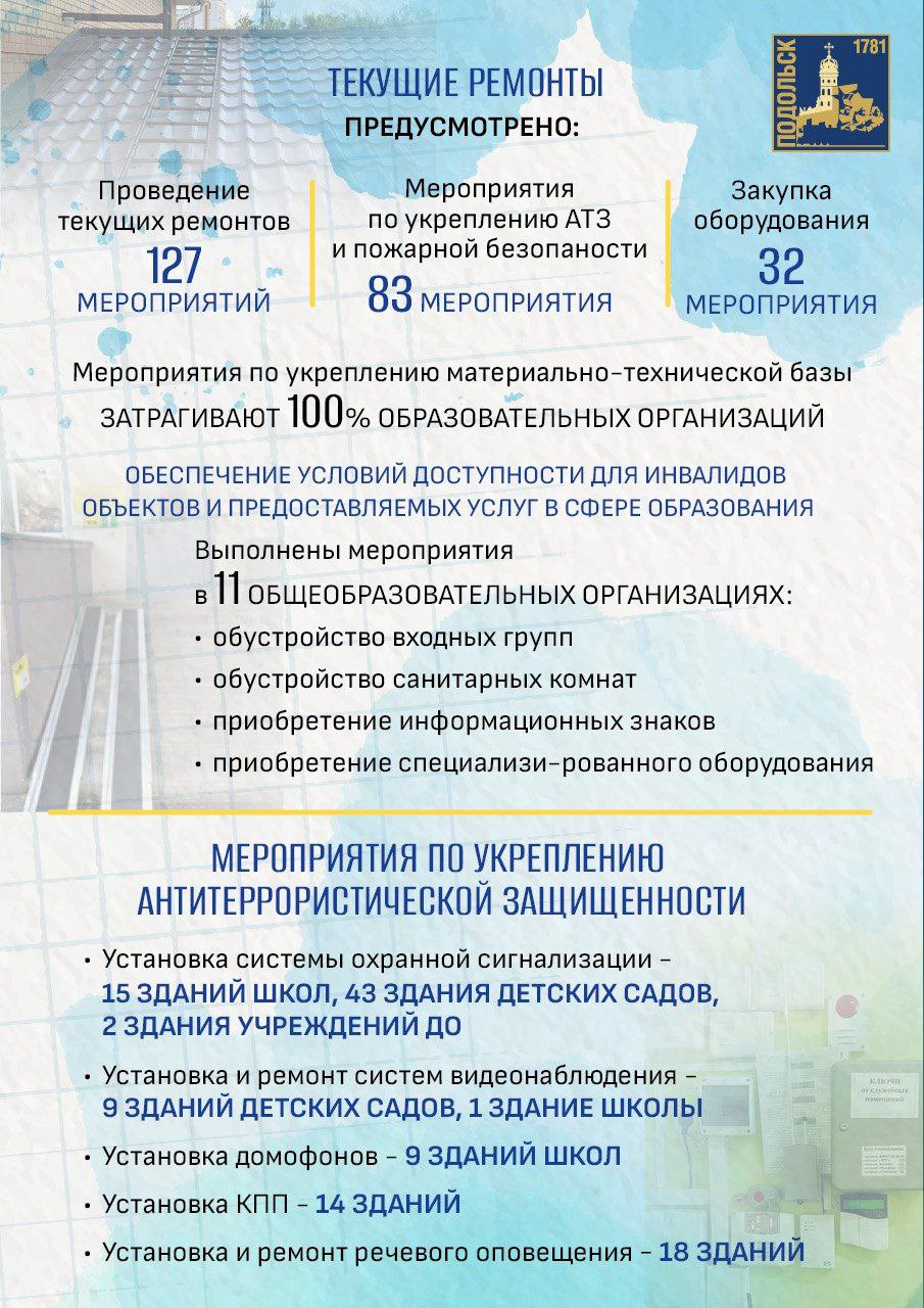Летом в зданиях провели плановый текущий ремонт, а пять образовательных корпусов получили капитальное обновление. Помимо этого, свои двери 1 сентября откроют новая школа на 1 100 мест в Климовске, пристройка к школе № 29 и детский сад в ЖК «Каскад Парк». Учебники и оборудование уже на местах, классы ждут своих учеников.