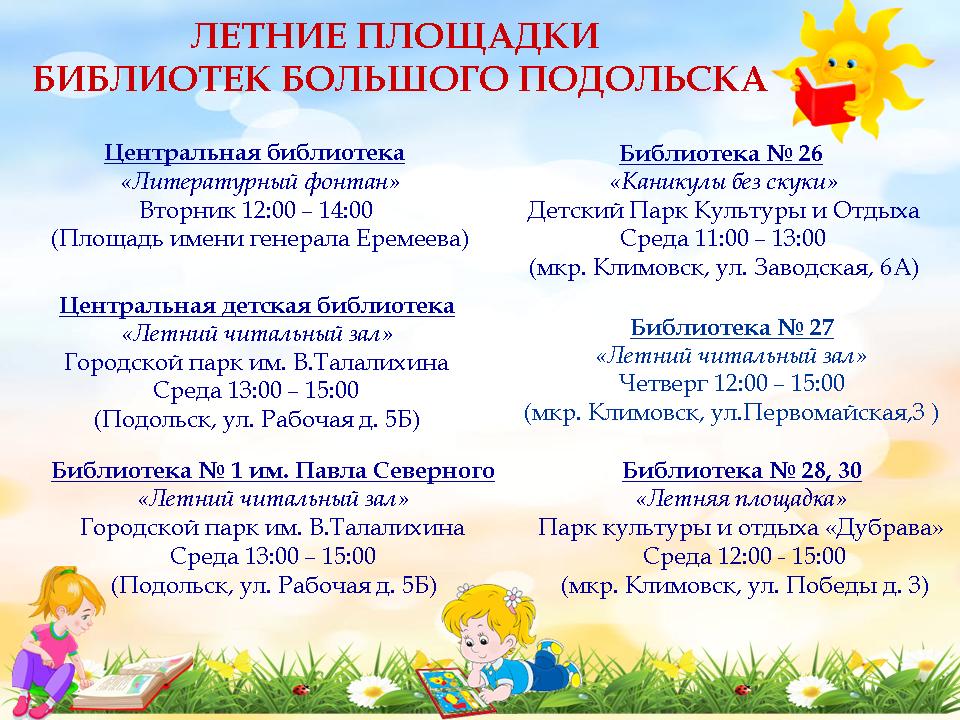 МЕДИАЦЕНТР — 6 июля, ПОДОЛЬСК — Так, главными площадками читальных залов стали городской парк имени Виктора Талалихина, площадь генерала Еремеева в Подольске, парк культуры и отдыха «Дубрава» и детский парк в микрорайоне Климовск, .