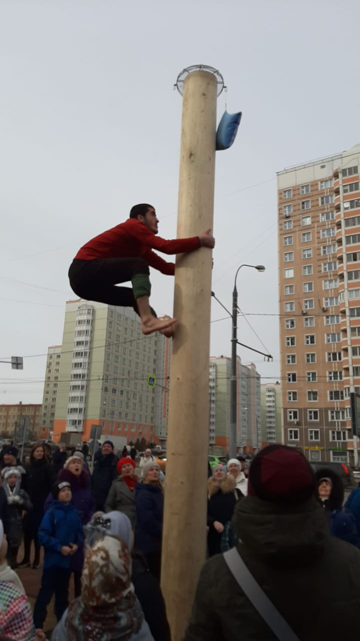 МЕДИАЦЕНТР — 1 марта, ПОДОЛЬСК — Для детей устроили самые разные конкурсы — кто лучше пройдет на ходулях, ловко пронесет коромысло с ведрами, не выронив из них ни одного мяча. Но самым зрелищным стало состязание молодых людей, пытающихся взобраться на гладкий столб за призами. Масленичный столб – традиционное русское состязание для ловких и отчаянных. И такие в Кузнечиках нашлись, в сложной борьбе им удалось добыть призы. Один из смельчаков – Алексей Ковун.