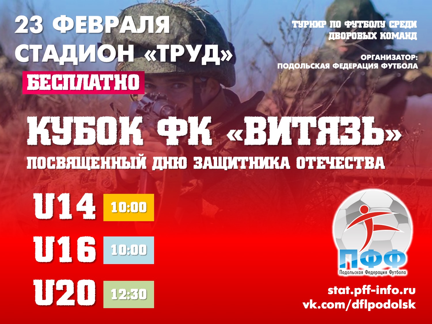 МЕДИАЦЕНТР — 19 февраля, ПОДОЛЬСК — А 23 февраля состоится первый в новом году турнир на футбольном поле на Кубок «Витязя», приуроченный ко Дню защитника Отечества. Уже третий раз новый сезон юношеских соревнований открывается этим турниром, проведение которого становится хорошей традицией.
