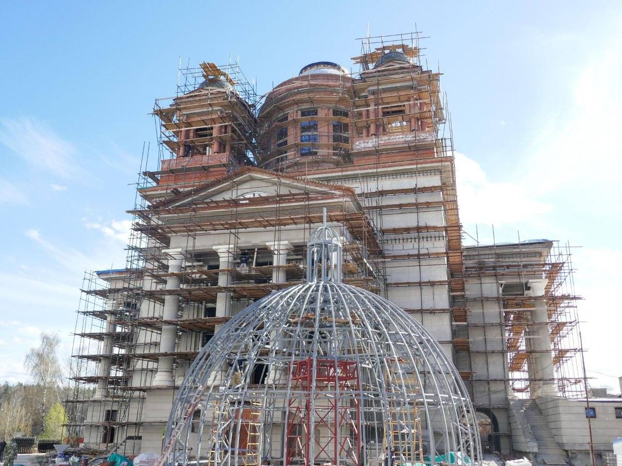 На стройке завершили сборку каркаса большого купола: его диаметр достигает почти 16 метров, а высота — около 10. Строители доделывают обрешетку, после чего приступят к обшивке. Материалом служат пластины нитрида титана — их цвет максимально приближен к золоту. Каждую такую деталь, как и для малых звонниц, изготавливают вручную прямо на месте.