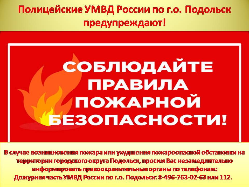 УМВД России по г.о. Подольск призывает граждан незамедлительно информировать правоохранительные органы о возникновении пожара или ухудшении пожароопасной обстановки на территории городского округа Подольск по телефону Дежурной части УМВД России по Г.о. Подольск: 8 (496) 763-02-63 или по номеру 112.