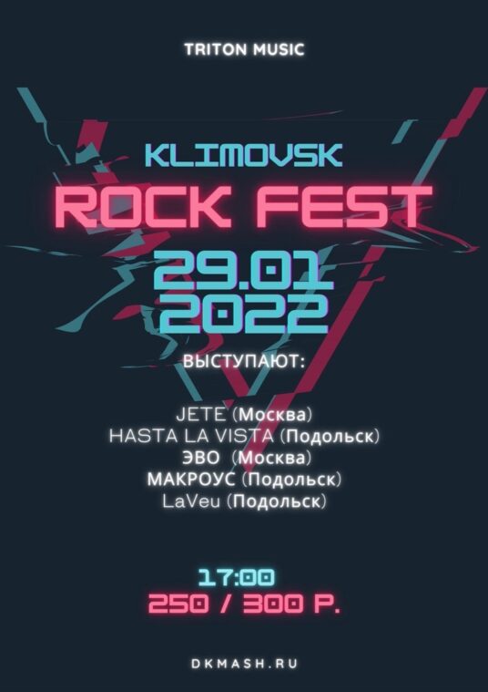 Ежегодный Klimovsk Rock Fest пройдет в ДК «Машиностроитель» 29 января. В В этом году на нем выступят подольские группы LaVeu, Макроус, Hasta La Vista, а также JETE и ЭВО из Москвы.