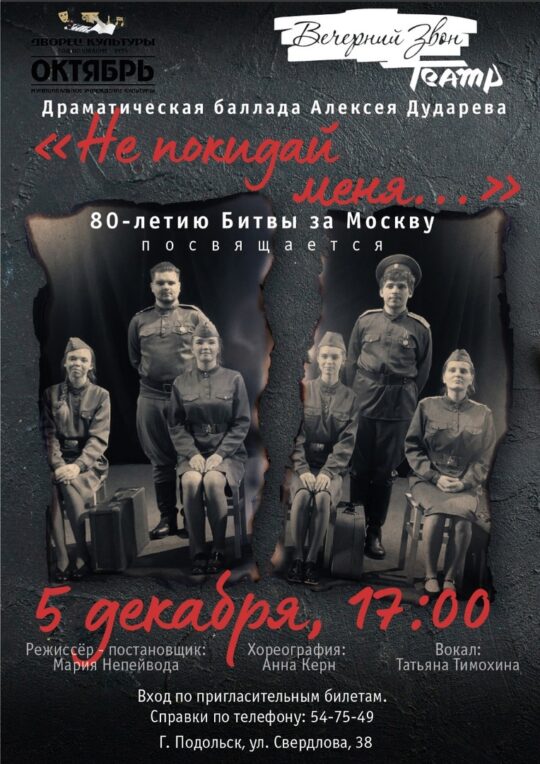 Дорогие зрители , 5 декабря , в день воинской славы России, образцовый коллектив “Театральная студия “Вечерний звон” спешит пригласить вас на спектакль по пьесе Алексея Дударева «Не покидай меня».