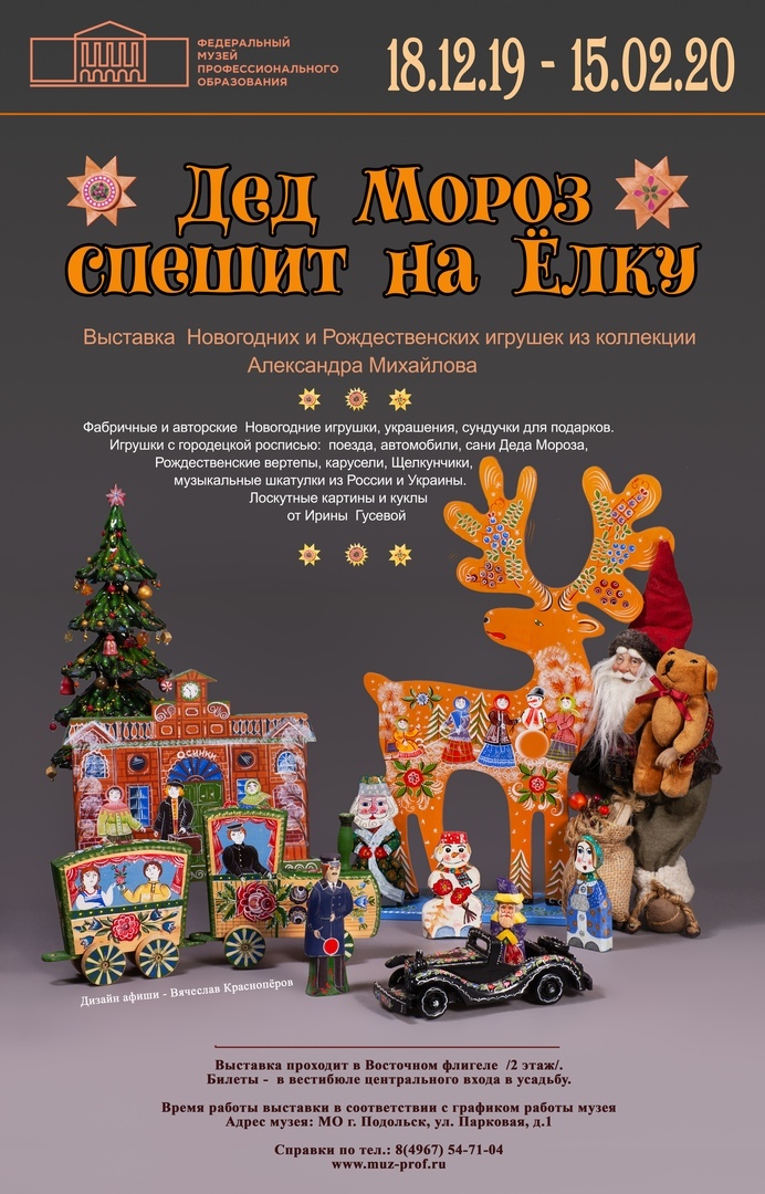 Красочная выставка «Дед Мороз спешит на Ёлку» московского коллекционера Александра Вадимовича Михайлова приурочена к традиционным русским праздникам — Новому Году и Рождеству Христову, она открылась в Федеральном музее профессионального образования в среду, 18 декабря. Об этом сообщили в Комитете по культуре и туризму администрации Городского округа Подольск.