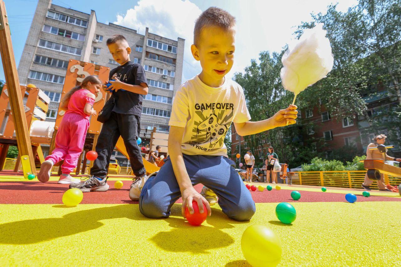 Яркие качели, горки и карусели уже радуют ребят во дворах на проспекте 50 лет Октября и улице Первомайской.