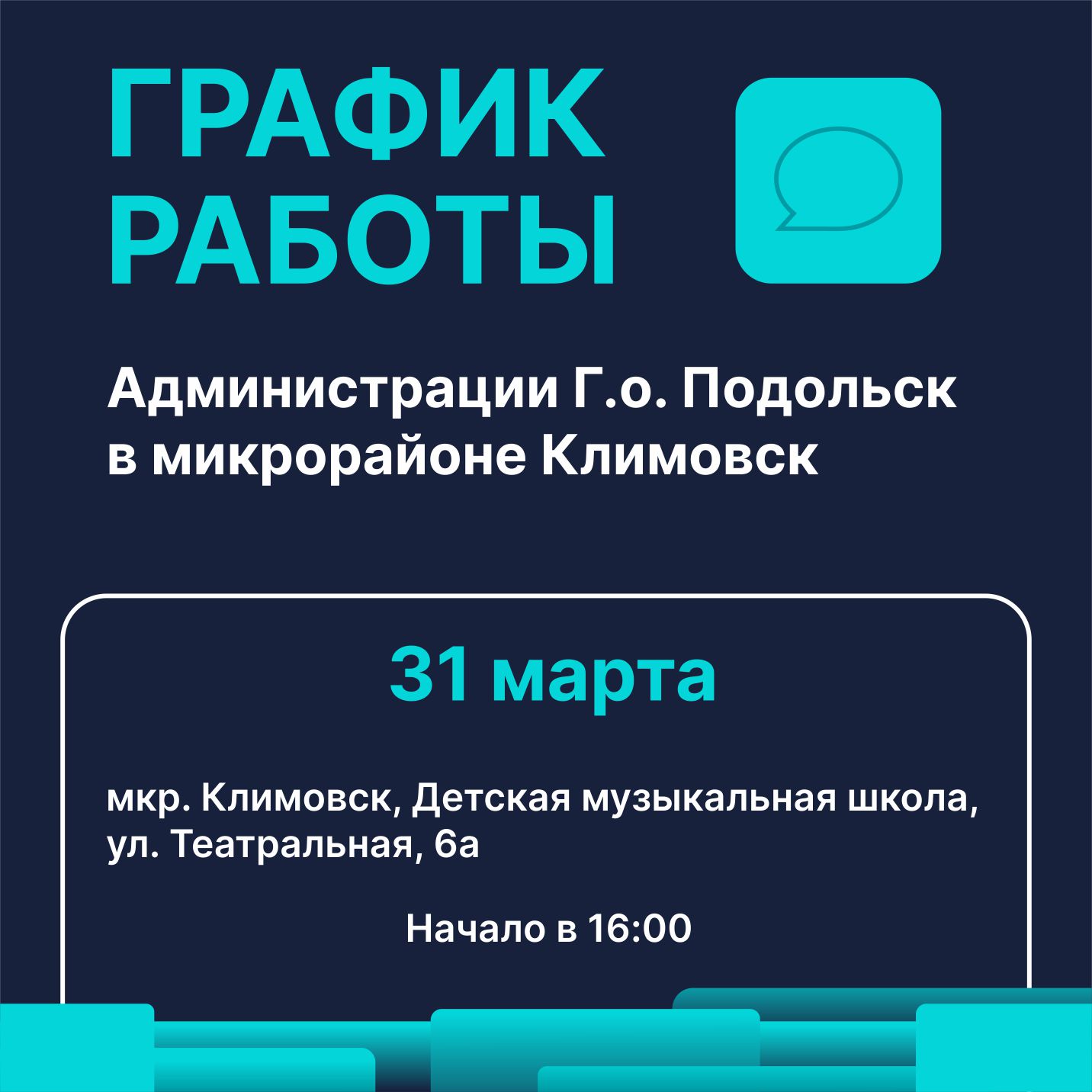 31 марта, в четверг, работа «выездной администрации» будет организована в мкр. Климовск в МУДО «Климовская детская музыкальная школа». Начало в 16.00.