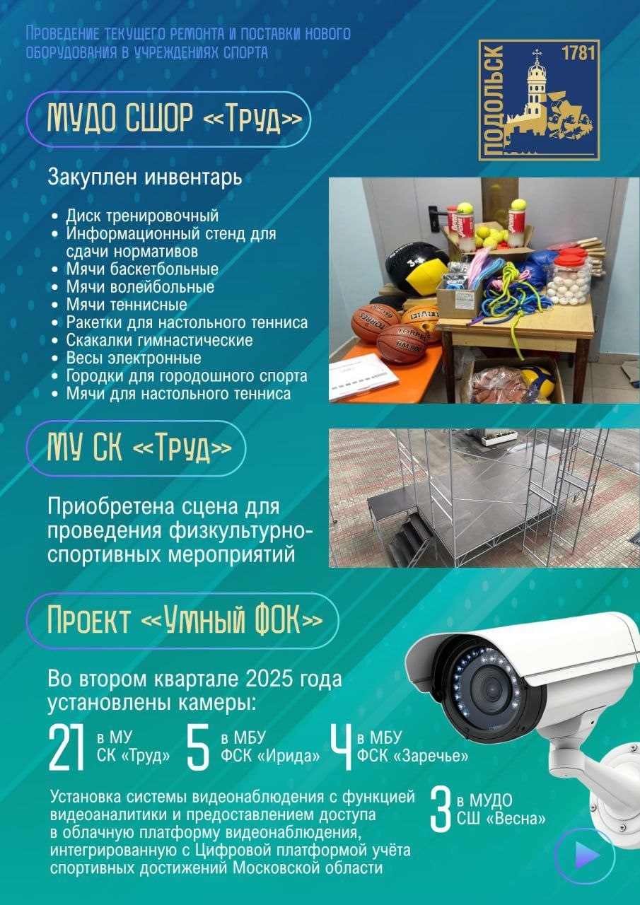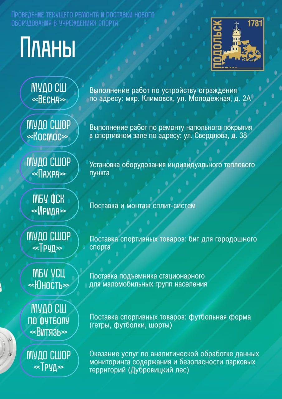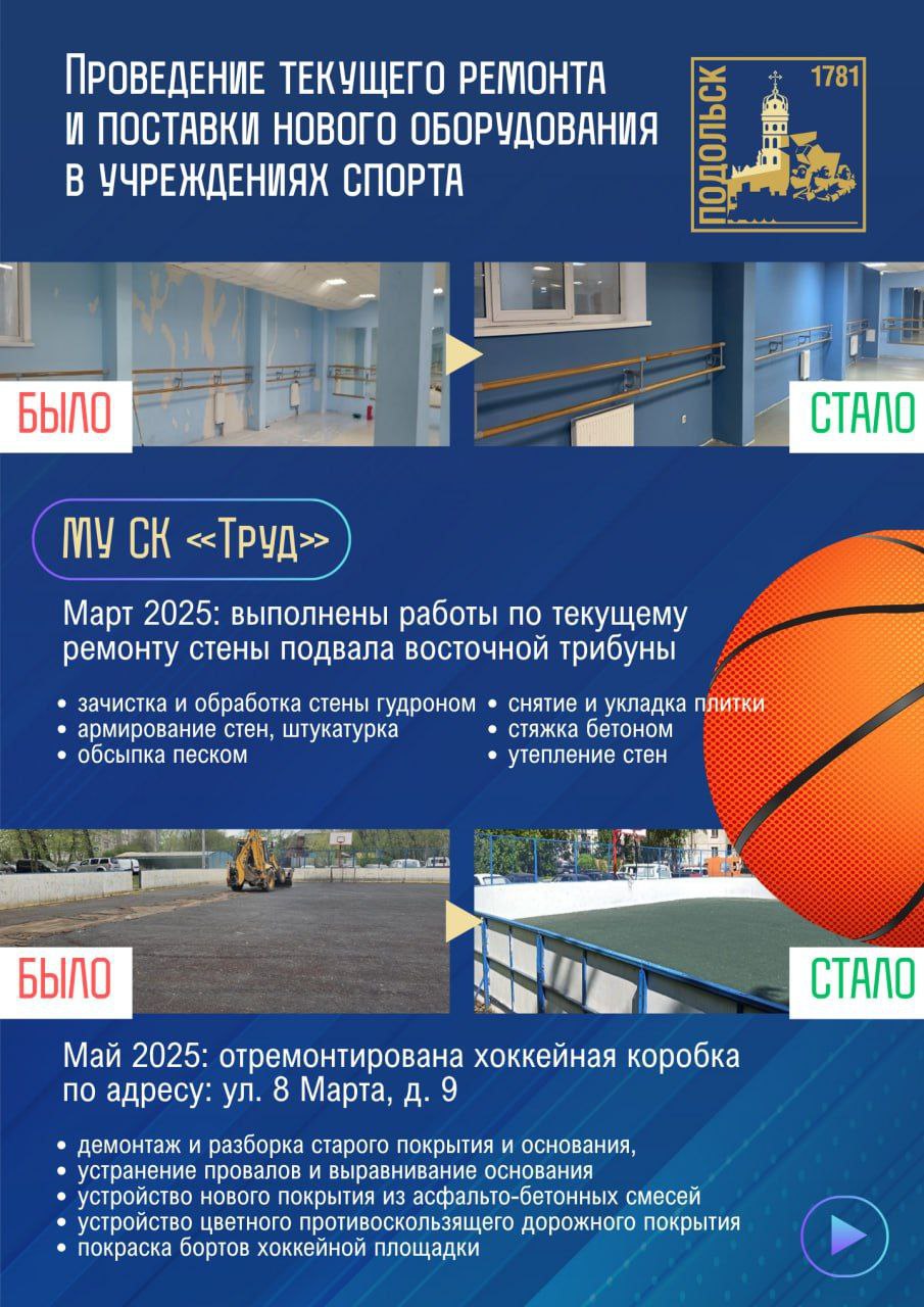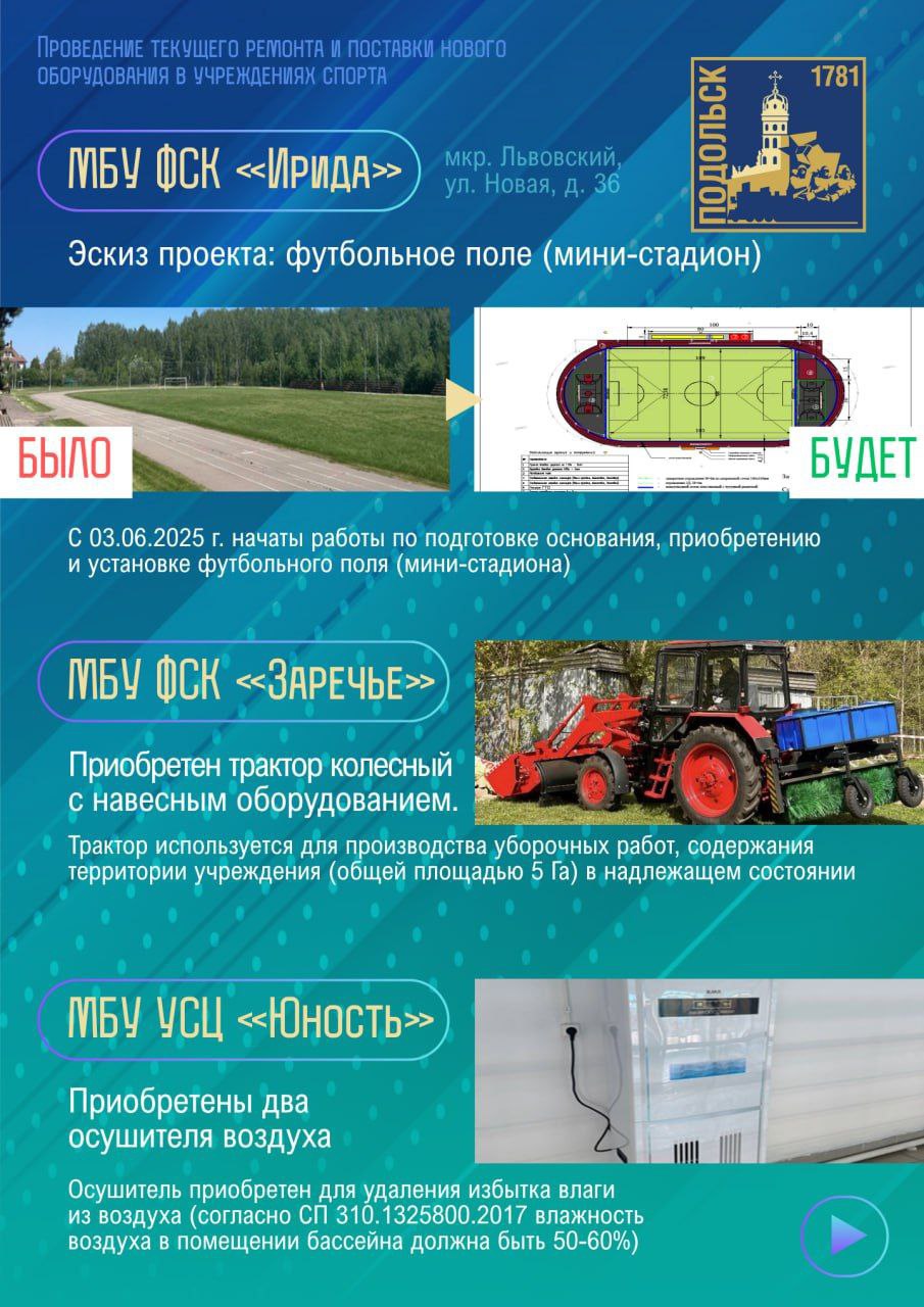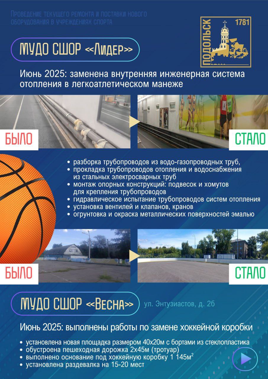 «Во второй половине года в нескольких учреждениях запланированы работы по ремонту пола, установке ограждений, тепловых пунктов, закупке формы, оборудования для маломобильных групп. Не останавливаемся, ведь комфортные условия для занятий спортом — это инвестиция в здоровье, развитие и будущее», — отметил глава городского округа Подольск Григорий Артамонов.