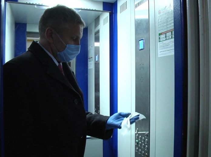 МЕДИАЦЕНТР — 13 апреля, ПОДОЛЬСК — Часть управляющих организаций на момент визита уже вела работы. Дезинфекцию проводили в доме № 7 по Архивному проезду, жители которого ранее сообщали, что в подъездах санобработку не делают. Виктор Швец с белой салфеткой в руках проверил подъезды, обратив внимание на ручки входных дверей, домофон, почтовые ящики, панели лифта.