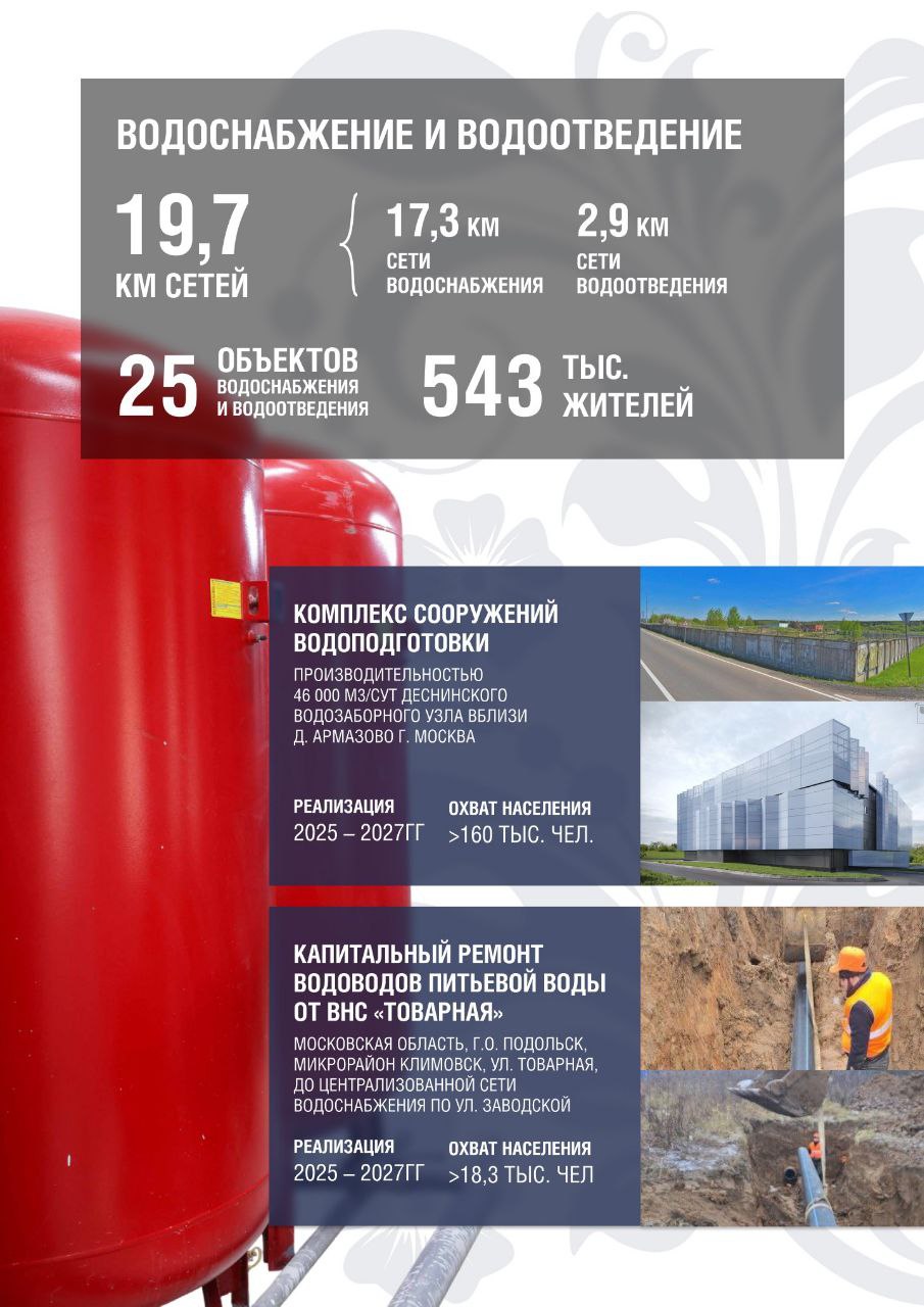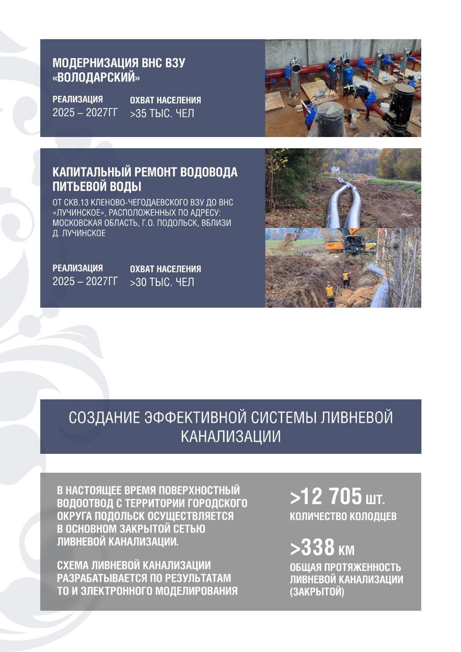 Вместе с этим модернизируют 12 объектов водоснабжения и 11 – водоотведения, почти 20 км сетей. Реализуются проекты по реконструкции водозаборных узлов, водоводов и очистных сооружений. Также разрабатывается схема строительства ливневой канализации. Уже в текущем году выполнят ее устройство на одном из проблемных участков – пересечении улиц Победы и Подольских Курсантов.