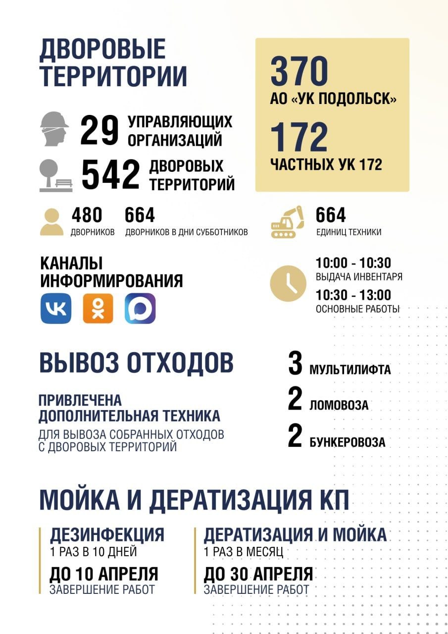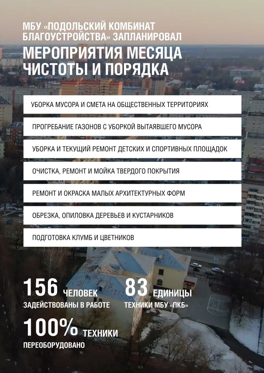 Работники Подольского комбината благоустройства выполняют широкий спектр задач: не только убирают мусор на общественных территориях, но и следят за состоянием детских и спортивных площадок, ремонтируют и окрашивают малые архитектурные формы, обрезают деревья и кустарники, готовят клумбы к высадке цветов. Вместе с этим идет сезонная уборка улично-дорожной сети: подрядные организации совмещают механизированную и ручную уборку, моют проезжую часть, знаки, ограждения и автопавильоны, чистят труднодоступные участки и тротуары, а также оперативно выполняют ямочный ремонт.