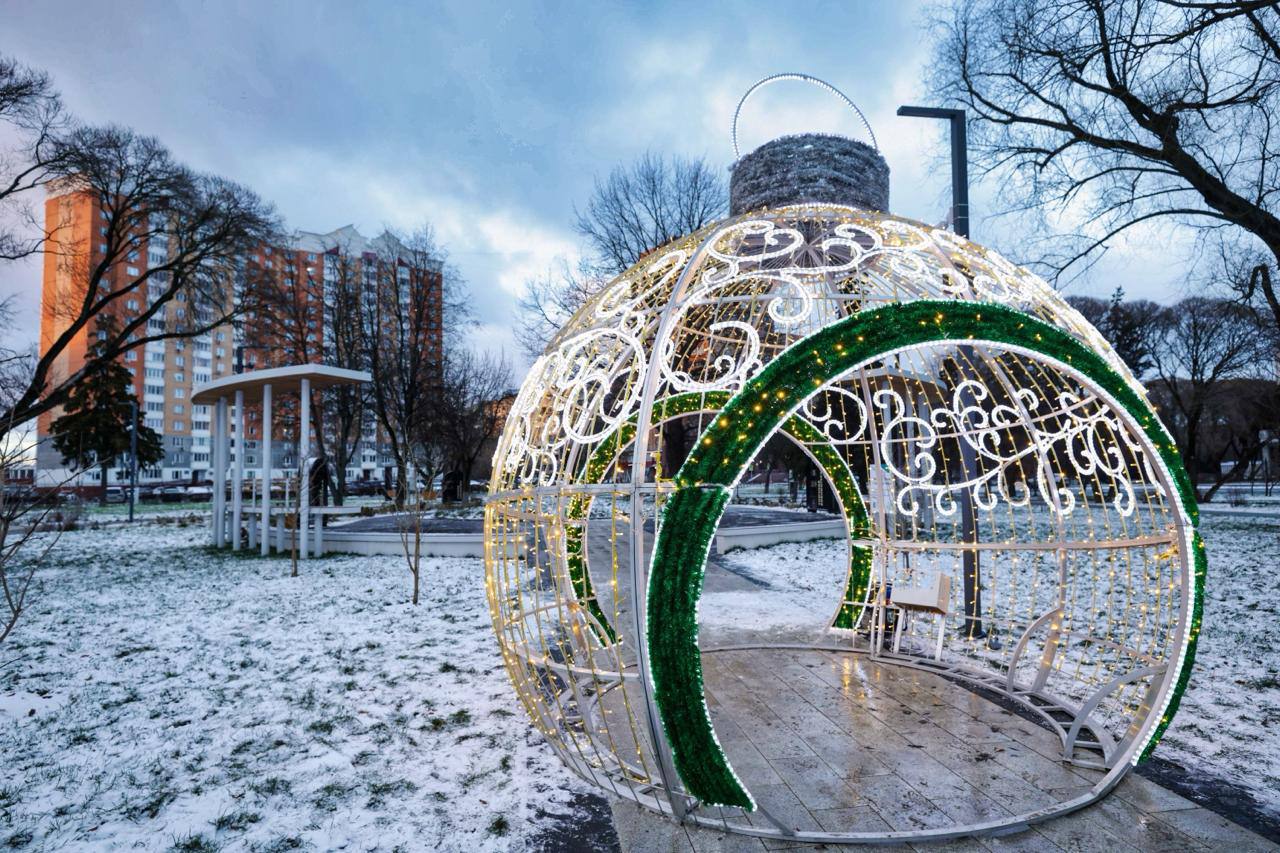 - Сквер имени А. С. Пушкина украсила величественная световая арка в виде шара, создающая праздничный портал.