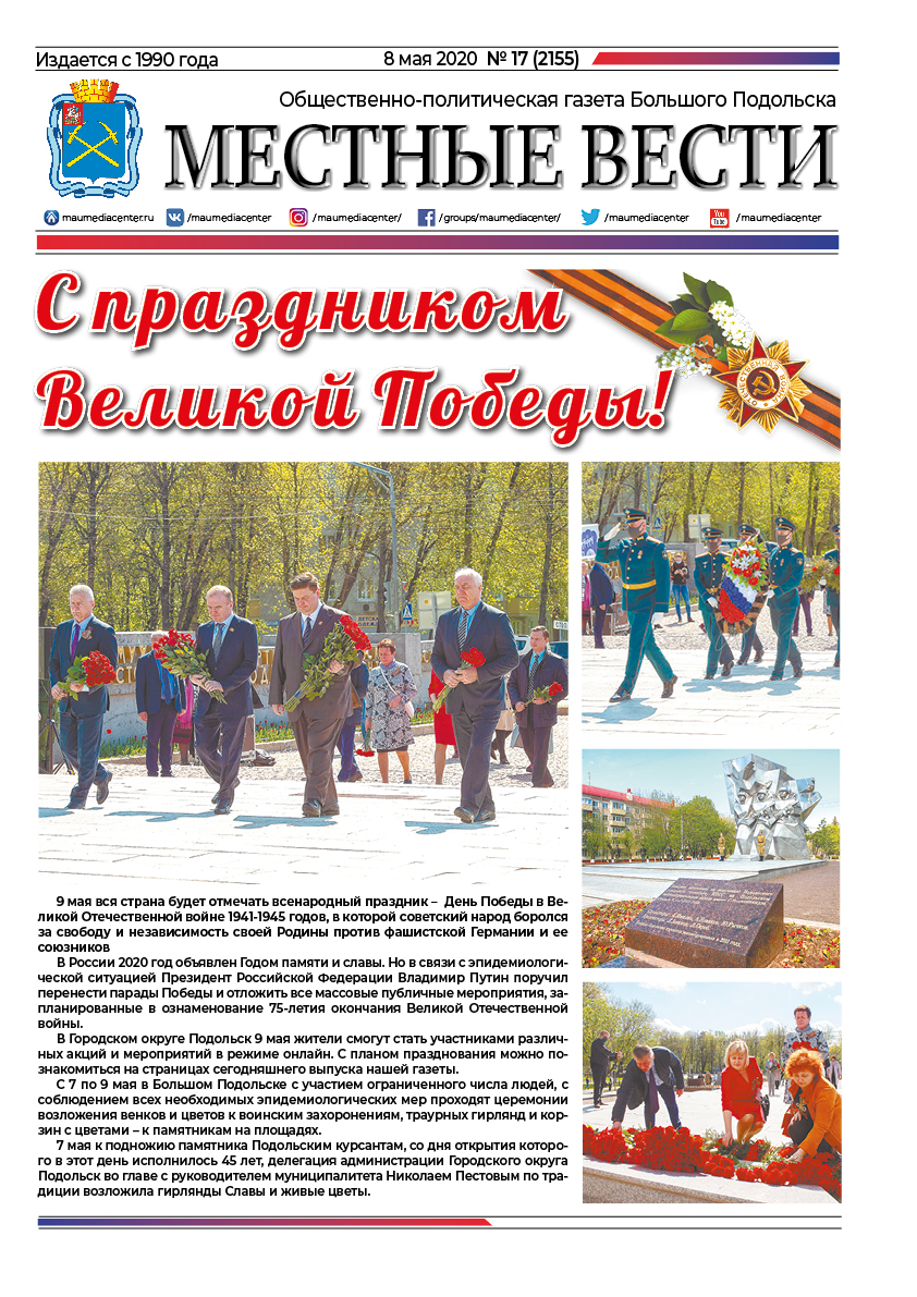 • В связи с эпидемиологической ситуацией все массовые публичные мероприятия отменены. В Городском округе Подольск 9 мая жители смогут стать участниками различных акций и мероприятий в режиме онлайн. С планом празднования можно познакомиться на страницах сегодняшнего выпуска нашей газеты.