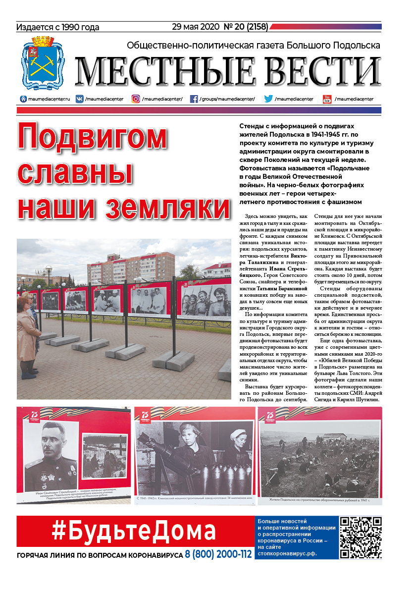 • Подвигом славны наши земляки. Стенды с информацией о подвигах жителей Подольска в 1941-1945 гг. по проекту комитета по культуре и туризму администрации округа смонтировали в сквере Поколений. Еще одна фотовыставка, уже с современными цветными снимками мая 2020-го – «Юбилей Великой Победы в Подольске» размещена на бульваре Льва Толстого.